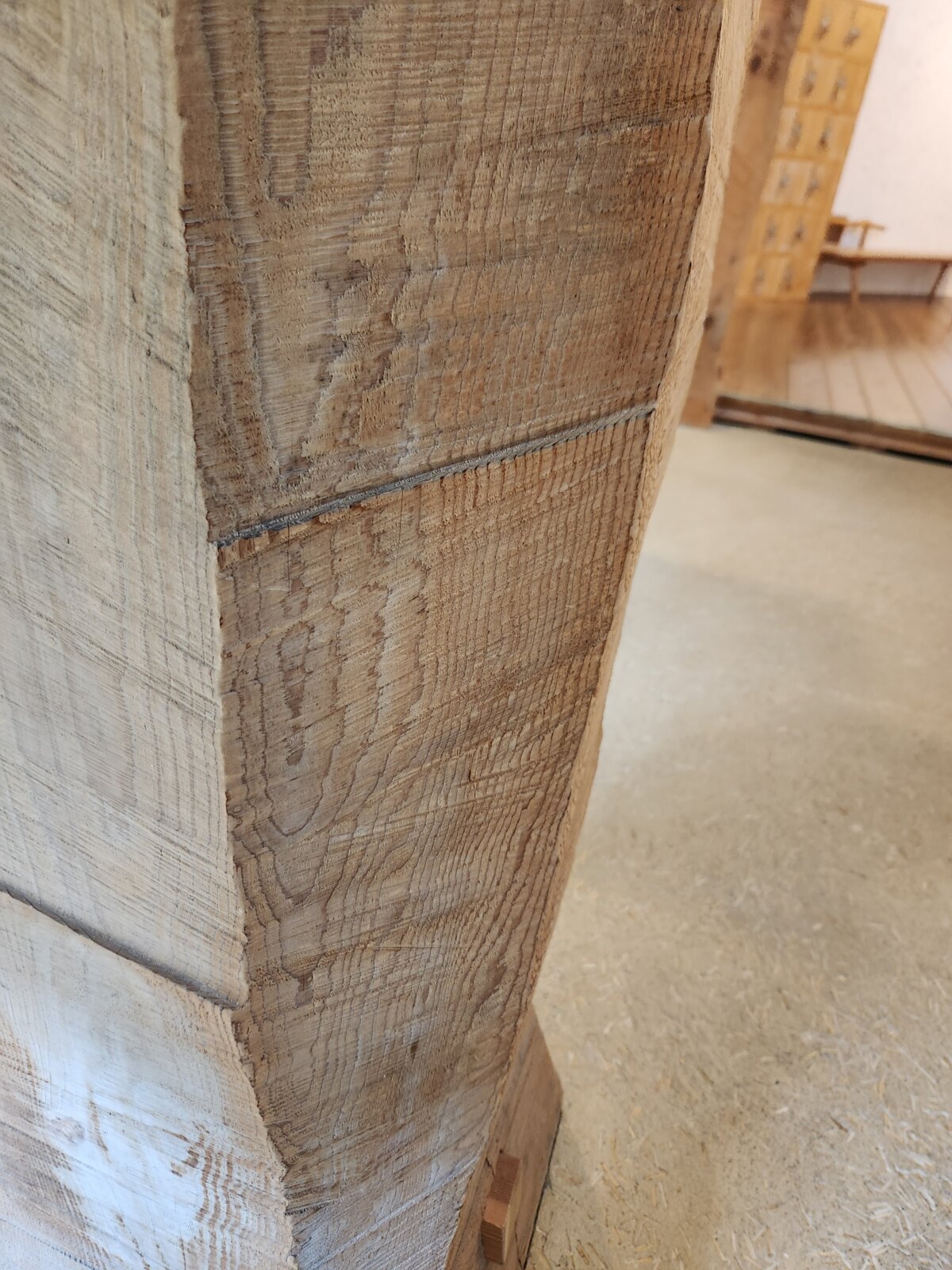 受付正面の太い天竜杉は、秋野画伯の息子さんがチェーンソーで独特の風合いに仕上げた見ごたえのある柱です。
