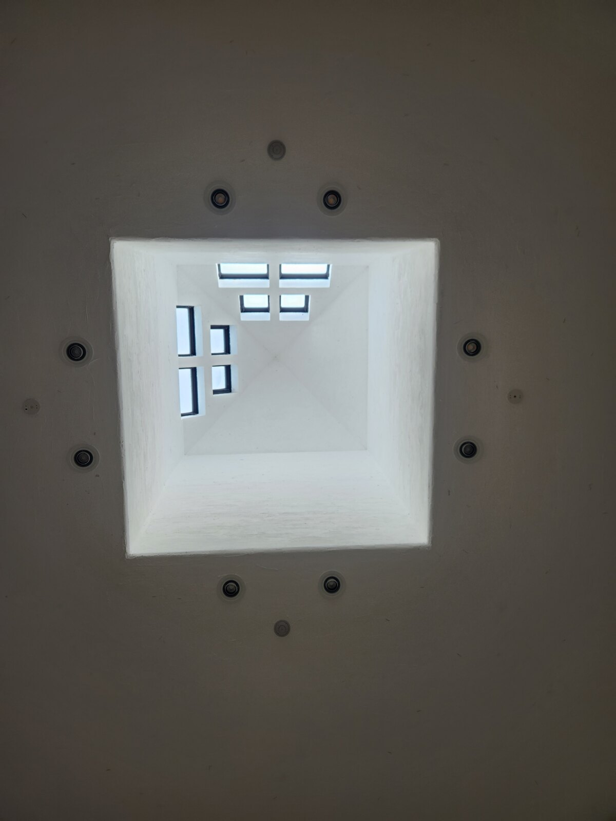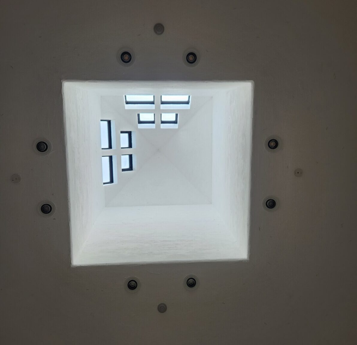 展示室中央から上を見上げると、北と西側だけに窓が作られています。この窓は、作品をより引き立たせるための採光を計算して作られているそうです。