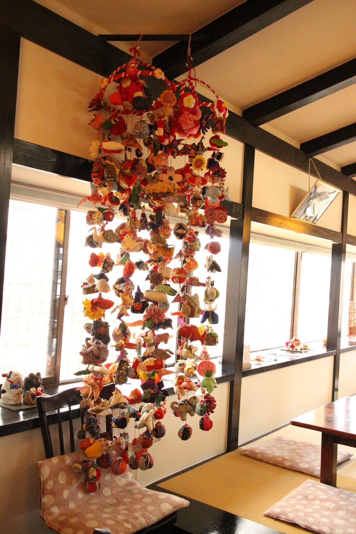 座敷席のそばに飾られている「つるし雛」は、店主のお義母様が手作りしたもの。こちらは毎年少しずつ新しいものを作って送ってくださるそうです。
