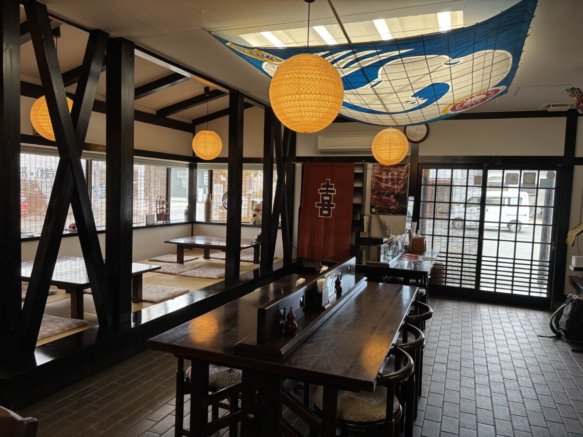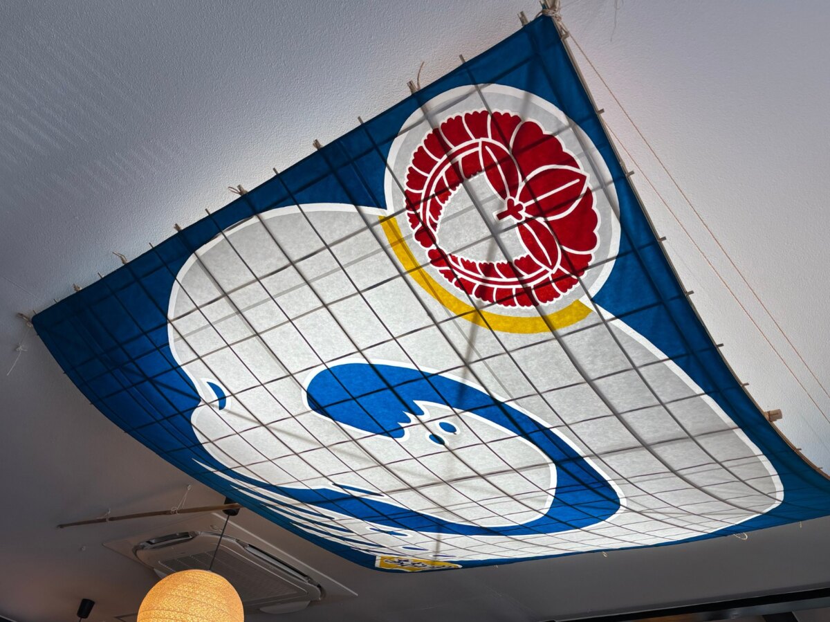 天井には、浜松名物の大きな凧「初凧」が飾られていました。2025年の訪問時、飾られていたのは3帖(1辺の大きさが2.4mのサイズ)の大凧。これでも浜松まつりで使われる凧の中では小さいものだそうです。