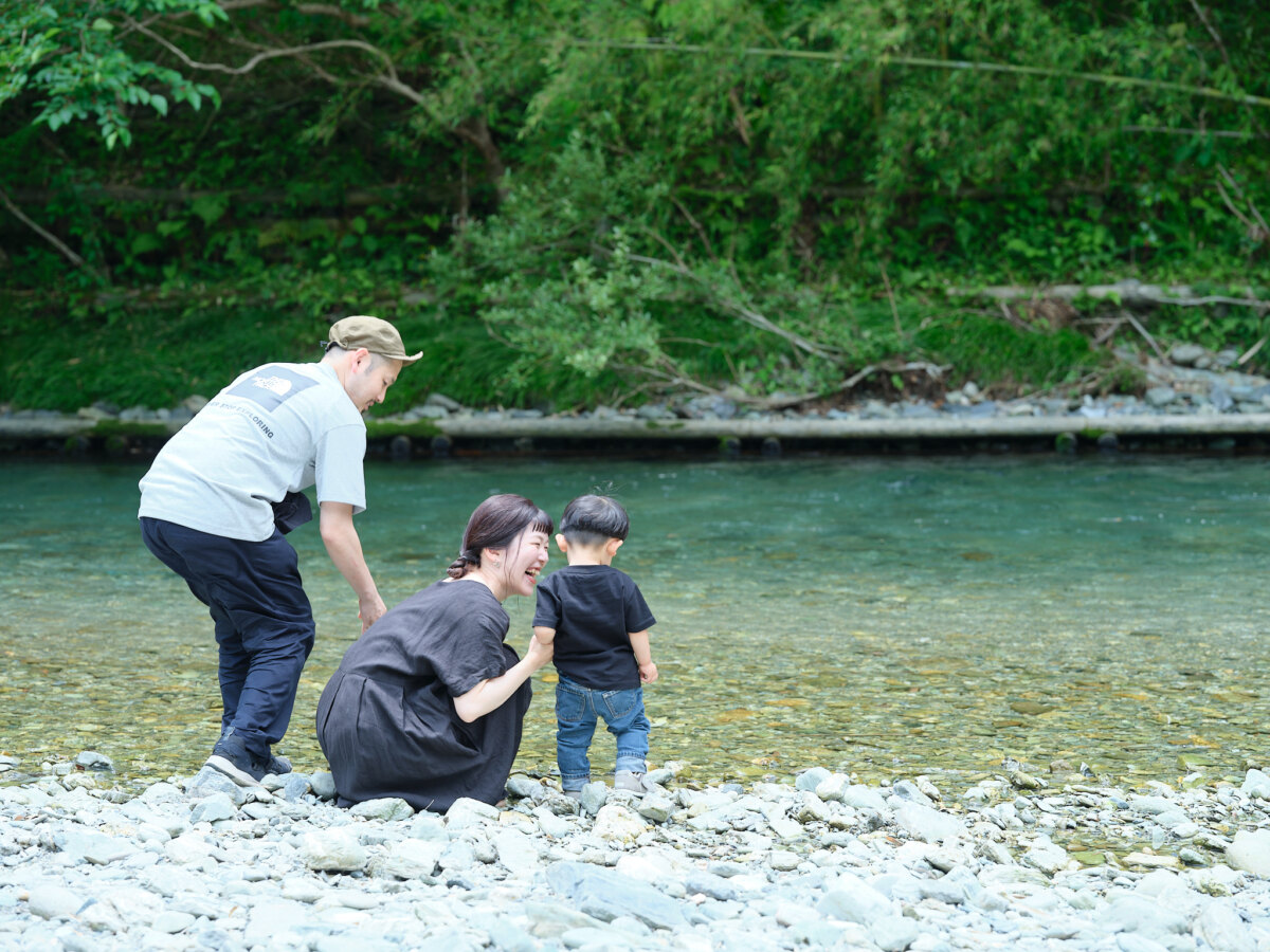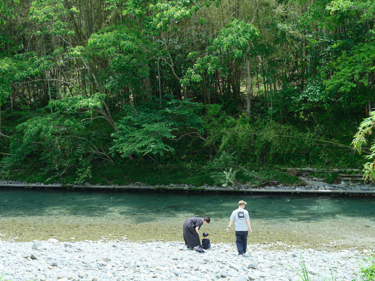 澄んだ川と深い緑に包まれる「atago feels」のキャンプサイト。