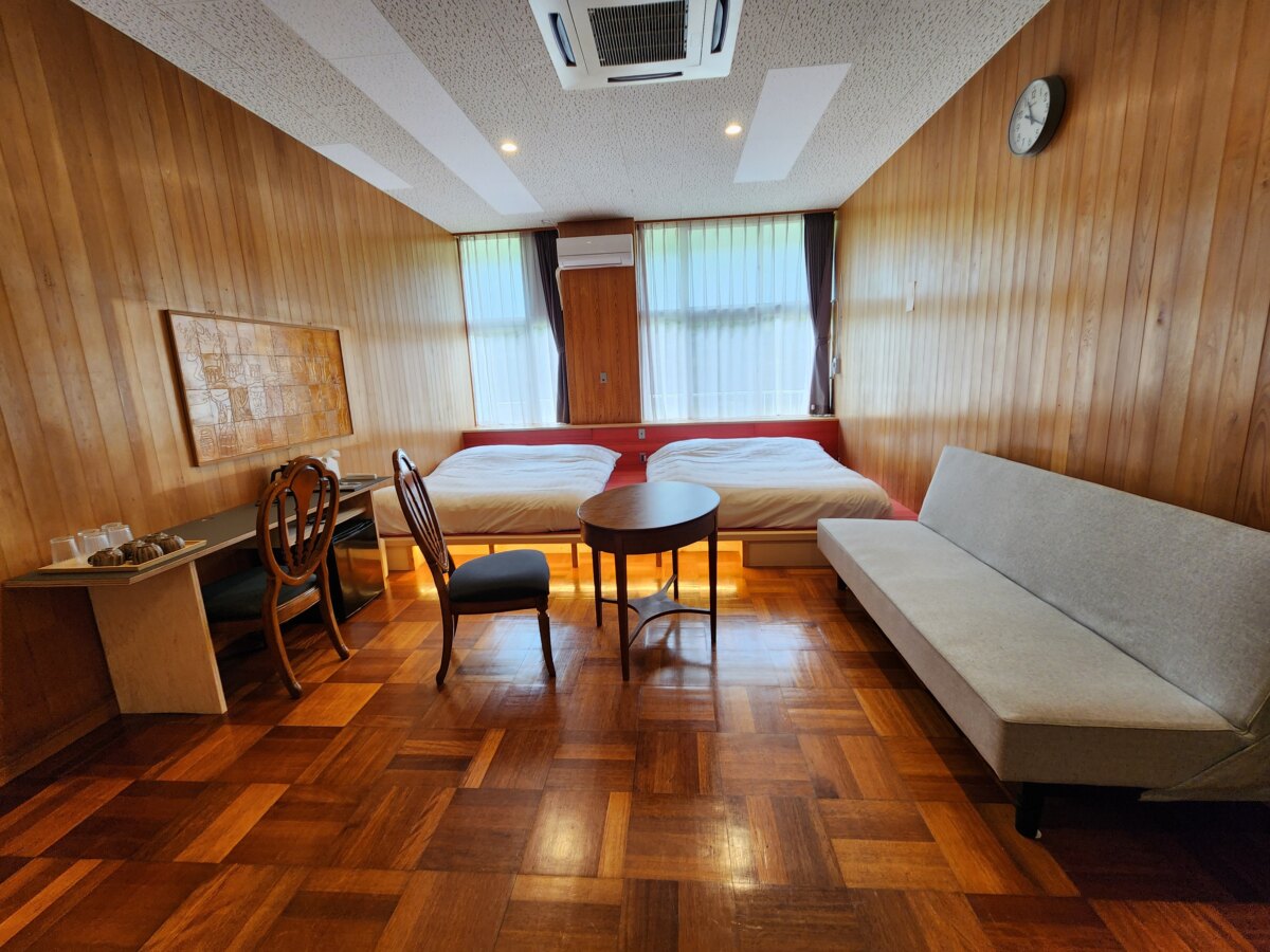 室内は、ヒノキ張りの重厚さと温かみ、アンティーク家具、えんじ色の桐材の小上がりが心地よく調和しています。壁には当時の絵もそっと残り「校長室に泊まる」特別な体験を楽しめます。