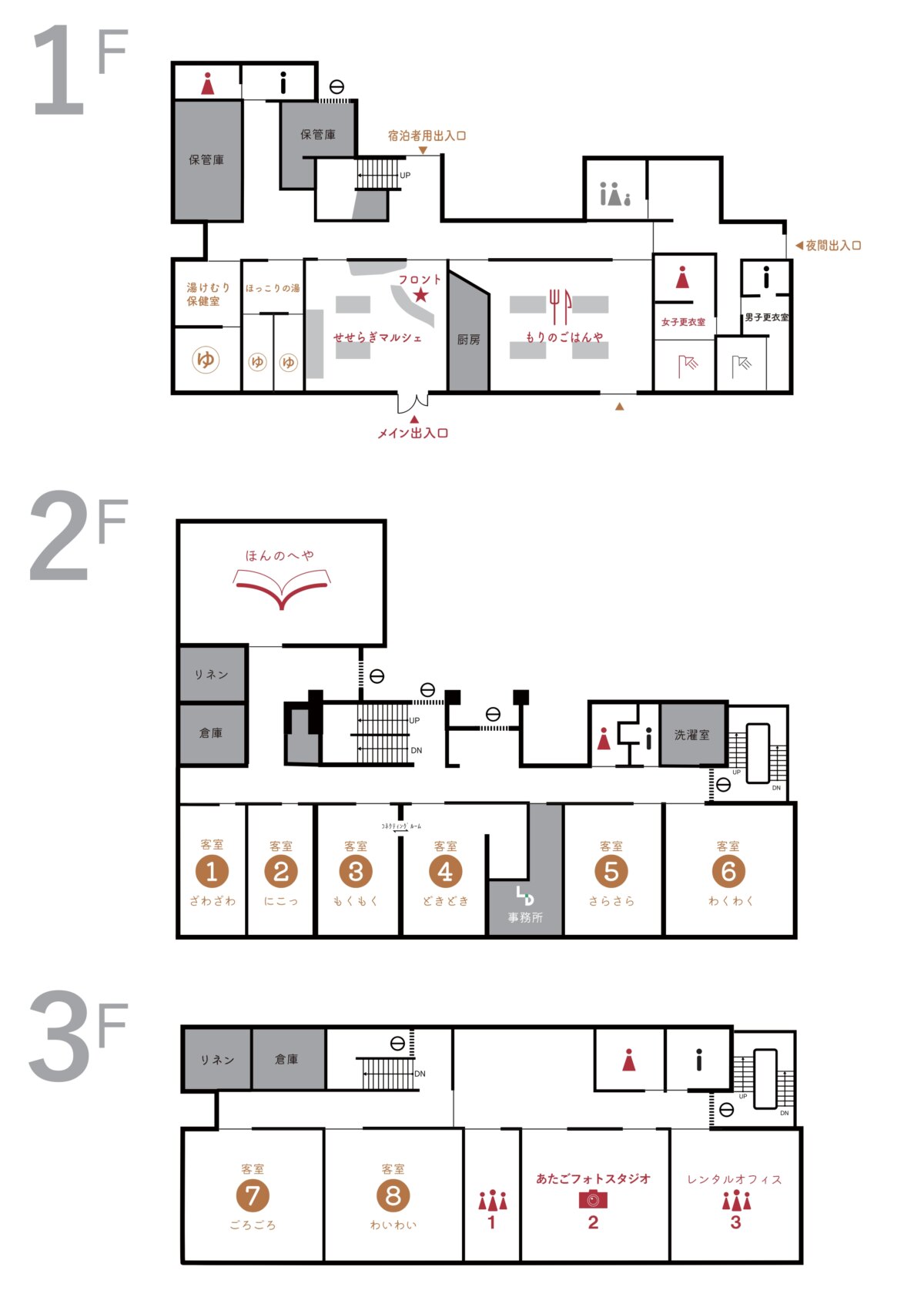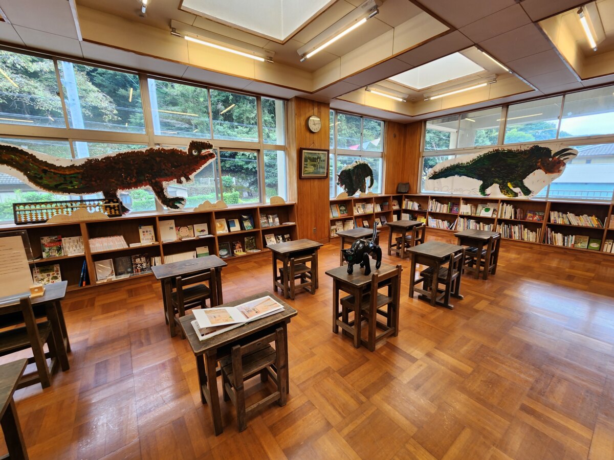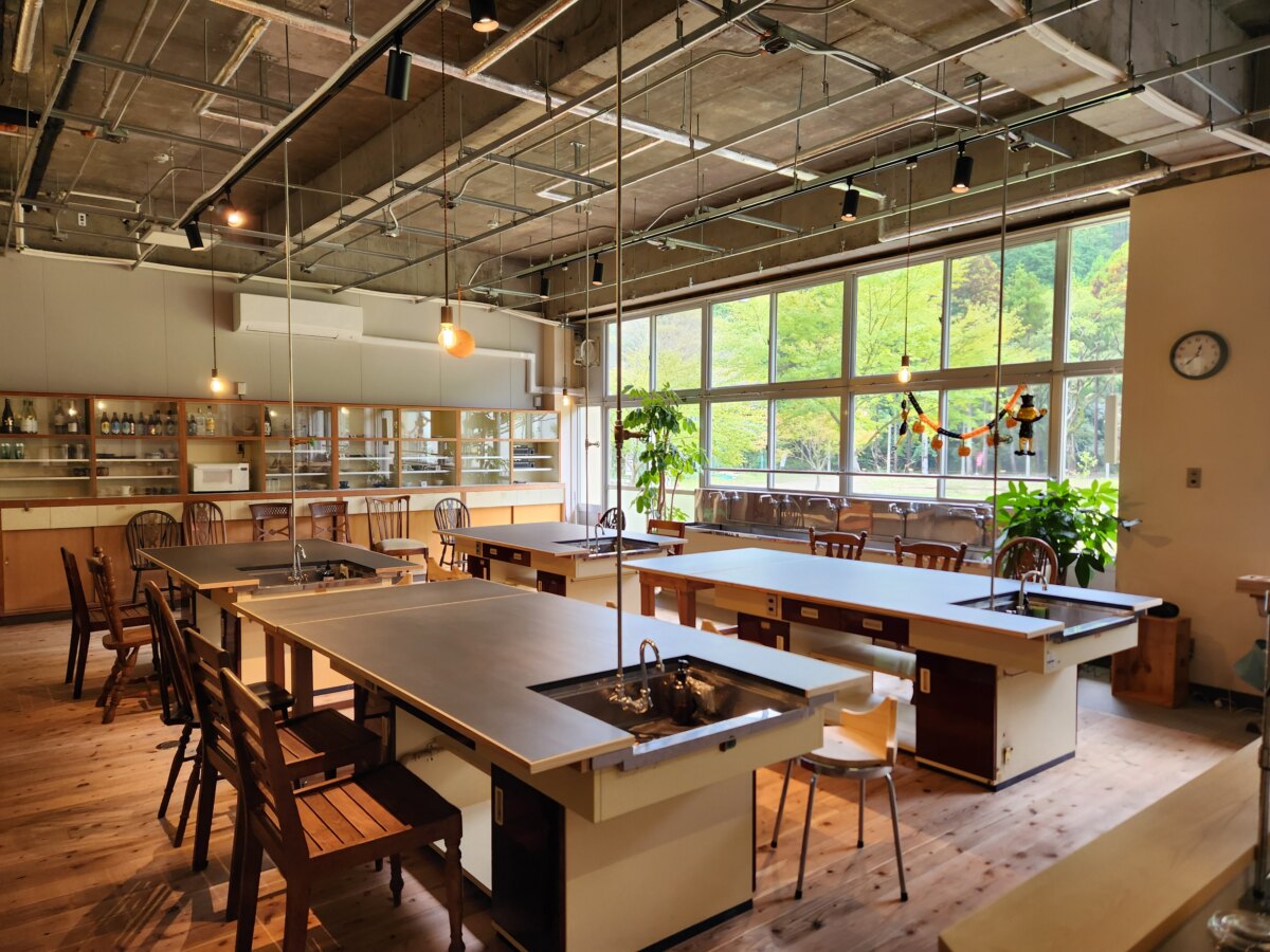 鉄筋コンクリート4階建ての校舎の1階には「せせらぎマルシェ」「フロント」「食堂」「貸切風呂」があり、2階には「室6部屋」と「図書室」、3階に「客室2部屋」が整備されています。