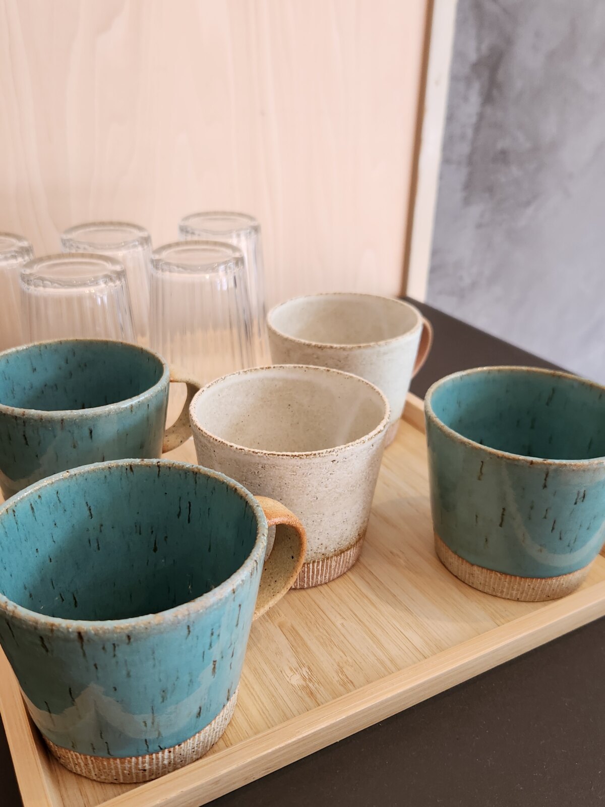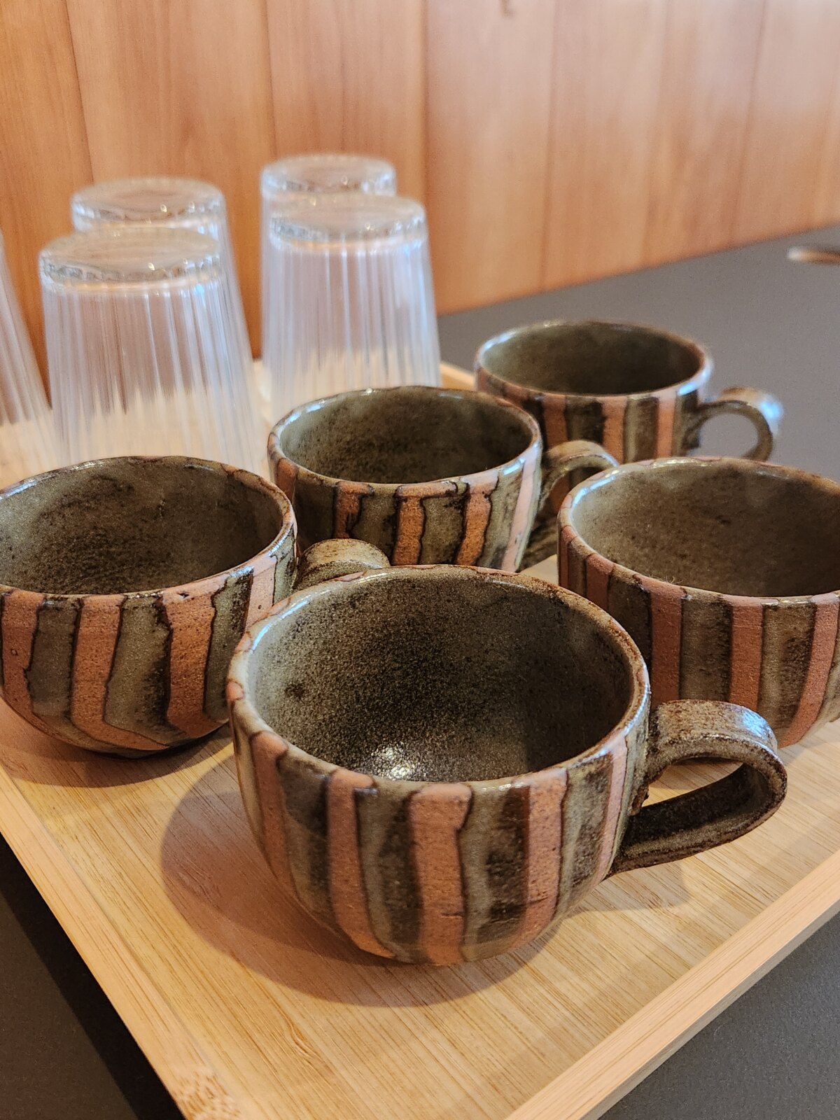 格子張の壁、茶色の桐材の床、懐かしい学校の机と椅子。光が差し込む明るい空間で、こだわりの珈琲や作家さんのカップを片手に、日常から少し離れてゆったりリラックスしてみてはいかがでしょうか。