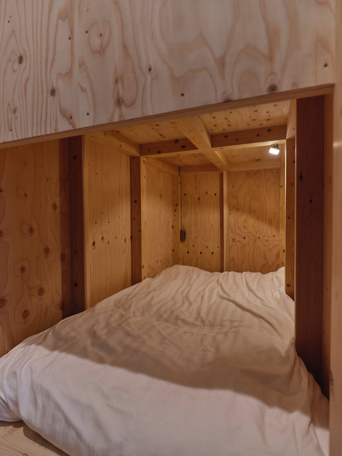 絵本の中の秘密基地のような「ごろごろ」は、立体的に組み合わさった3つの木製カプセルボックスが、プライベート空間を演出しています。