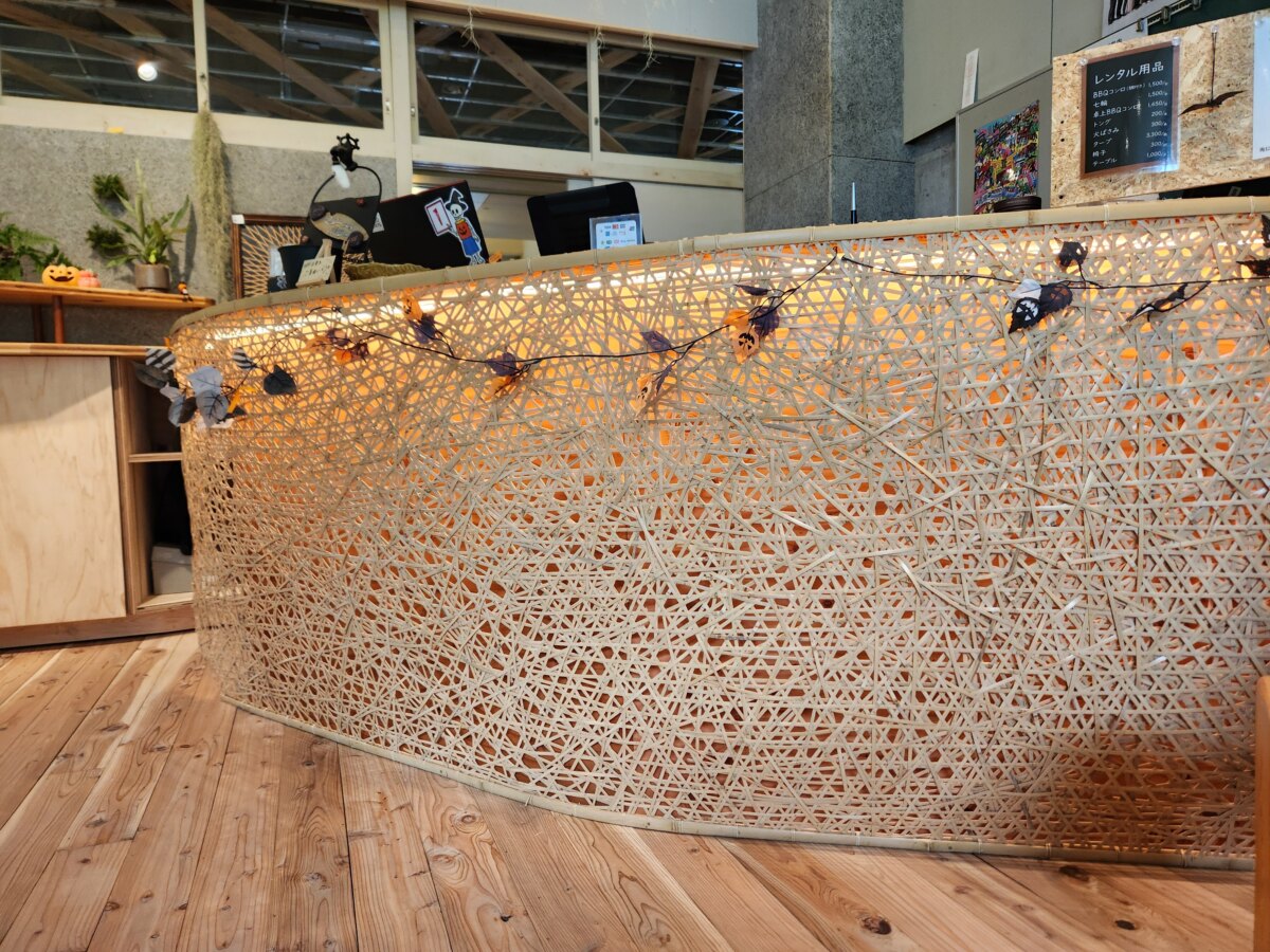 1階のフロントには、地元天竜阿多古の「竹」が使われており、地元の職人が丁寧に手作業で織り上げた美しいデザインが目をひきます。木の温もりと緑に包まれた空間です。