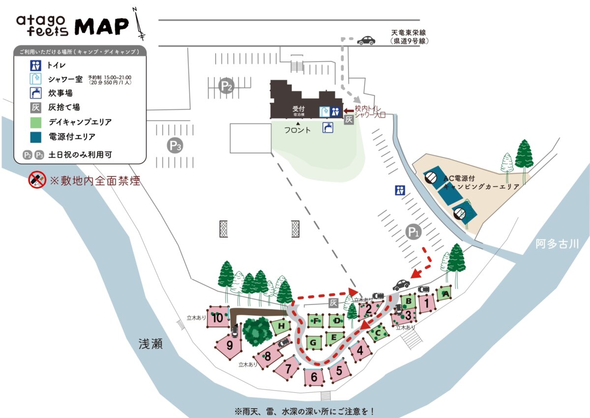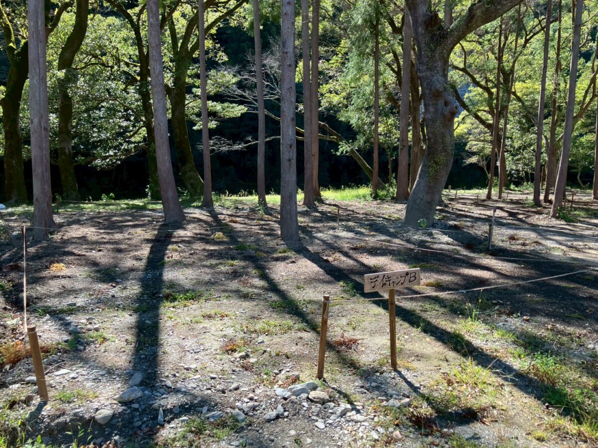 阿多古川沿いにデイキャンプの区画が8カ所、宿泊キャンプが楽しめる区画が10カ所整備されています。