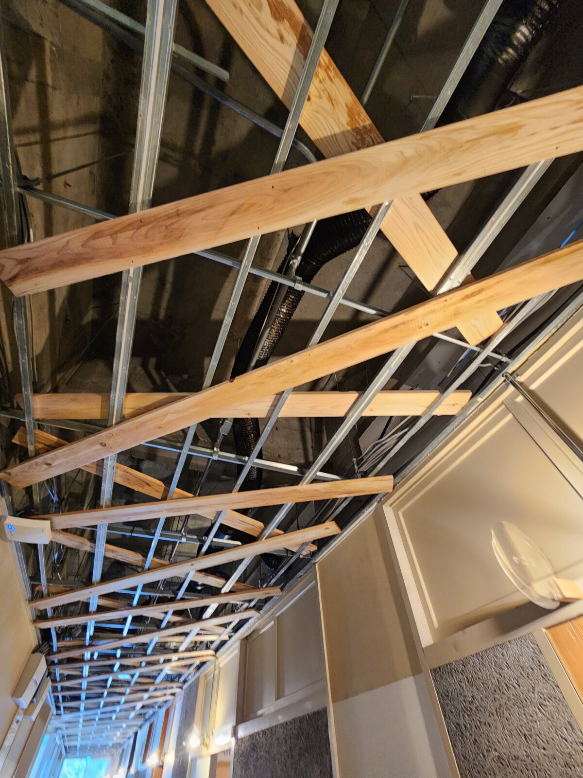 廊下の天井はランダムに組まれた屋久杉と無機質な鉄骨が絶妙なバランスで調和しています。