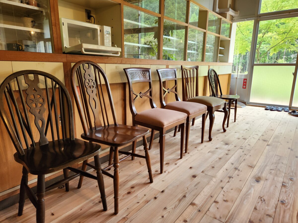食堂の椅子はアンティーク家具を買い付け、ひとつひとつの個性が光るものを使用。中には100年越えの貴重な椅子もあります。