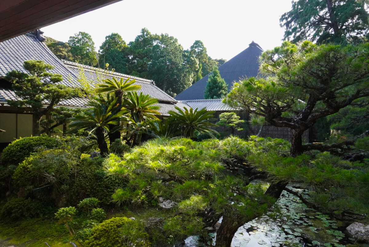 は「蓬莱式池泉観賞式庭園」と呼ばれる客殿の北側に広がる庭園は、江戸時代初期の大名茶人であり、作庭家としても名高い小堀遠州の手によるものと伝えられています。