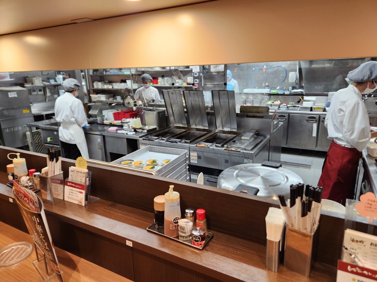 「自分の食べる餃子が、どのように製造され、テーブルまで運ばれてくるのか分かるように」と、オープンキッチンで調理されており、食の安心・安全が可視化できます。