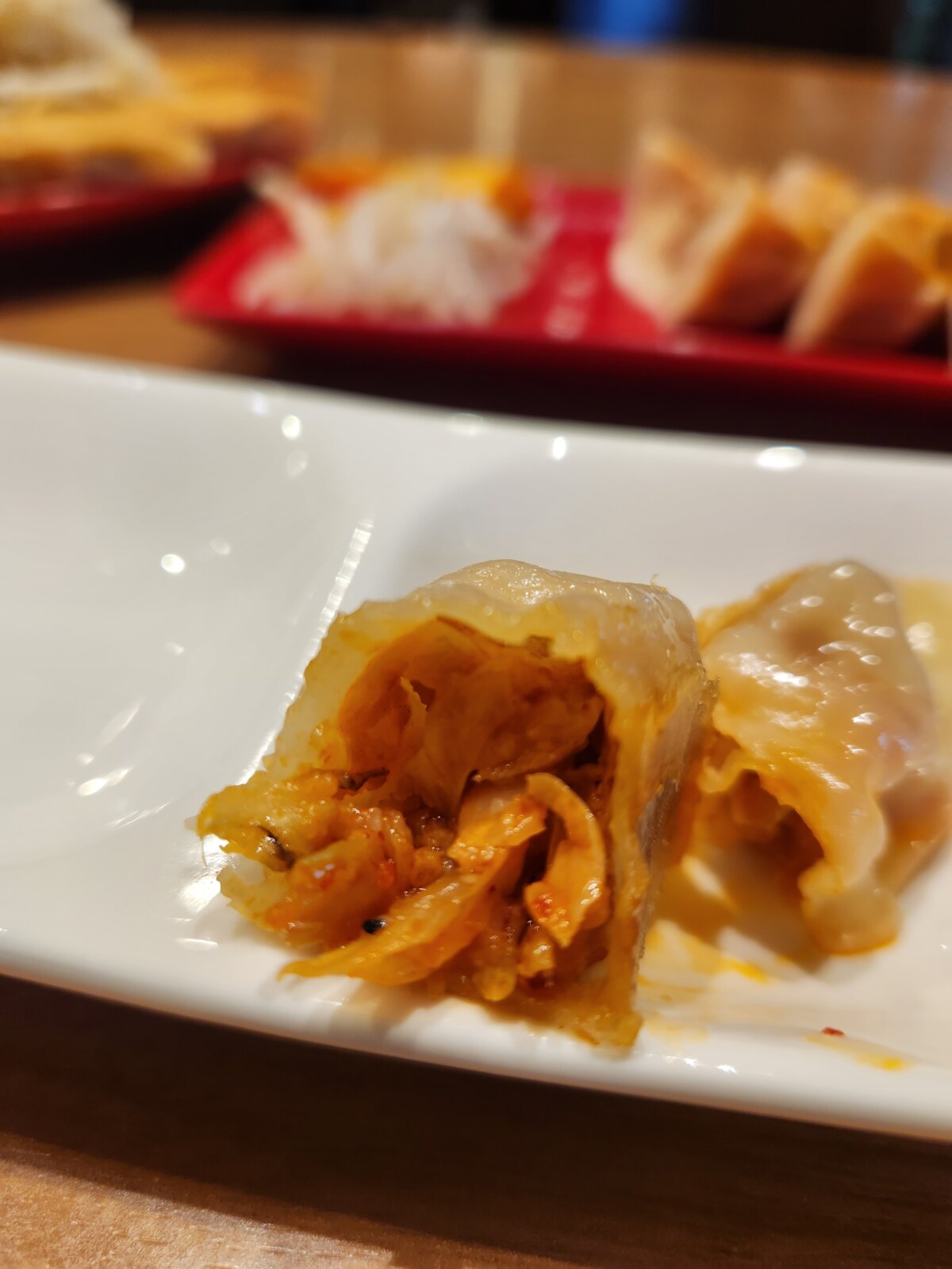 餃子餡にキムチがぎっしりと詰まった餃子ですが、見た目ほど辛くなく、ご飯のお供として「おかず」的な存在の餃子。