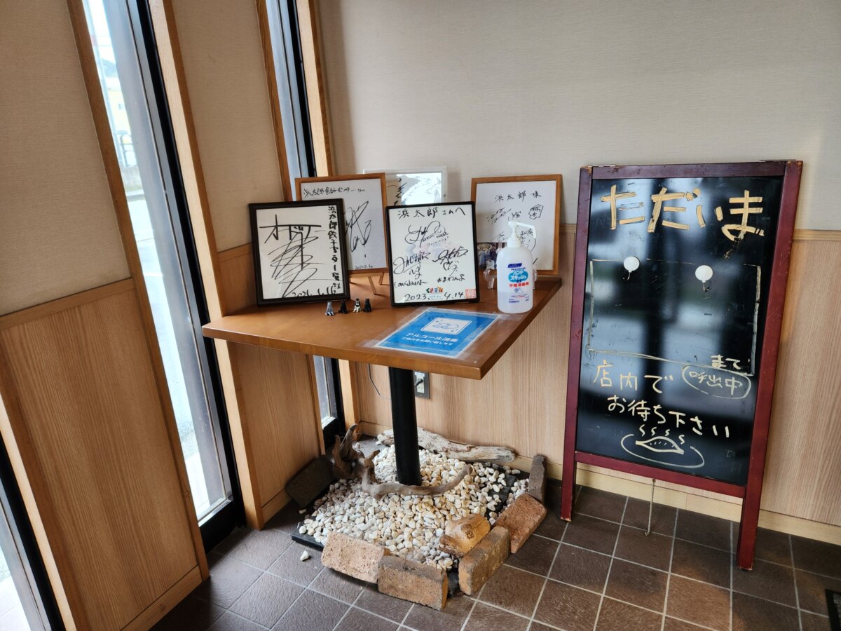 店舗に入ると正面の壁に大きな書物。浜太郎の餃子を食べて、お腹も心も満たされる気持ちが表現されています。