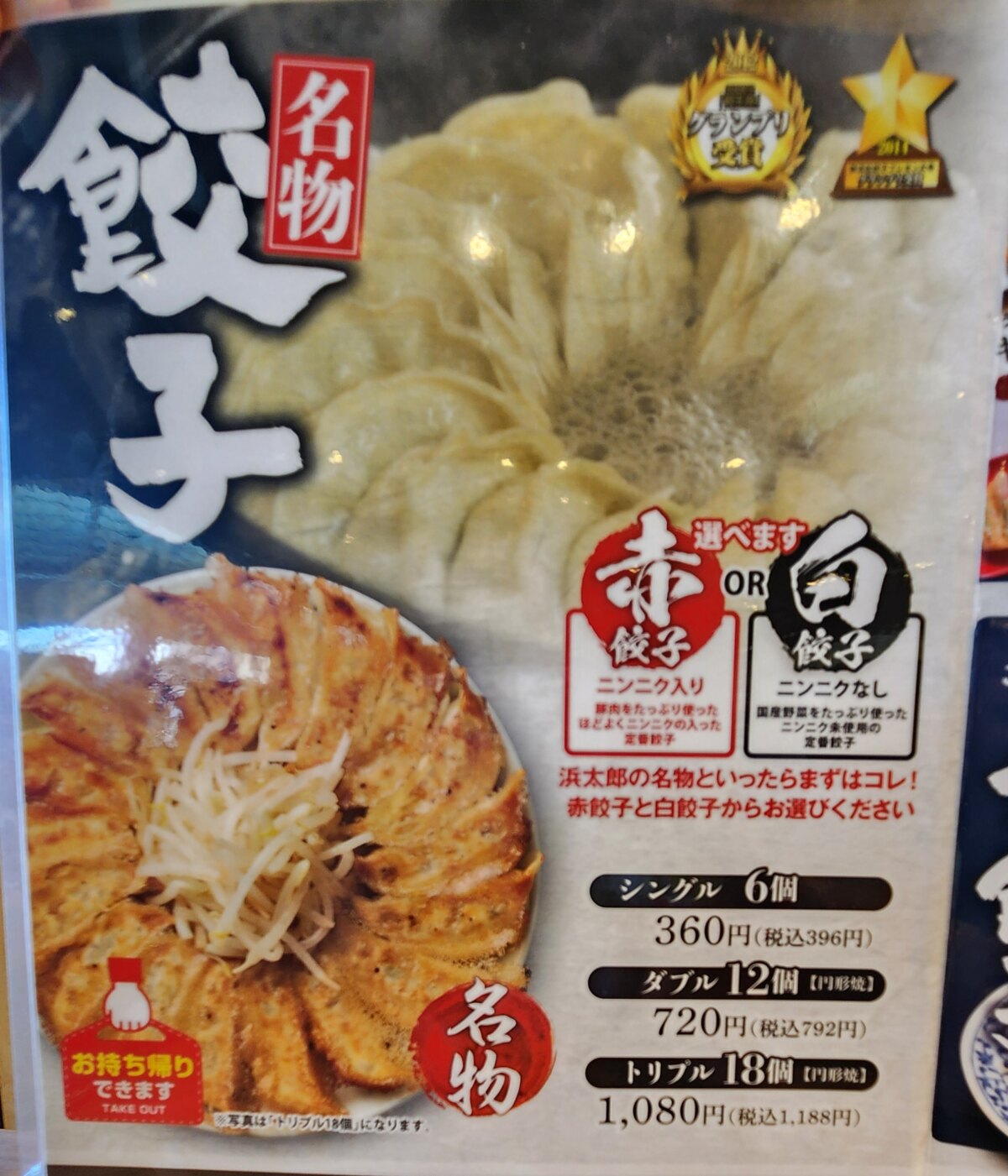 浜太郎の定番といえば、国産ニンニク入りの「赤餃子」とニンニク不使用の「白餃子」。