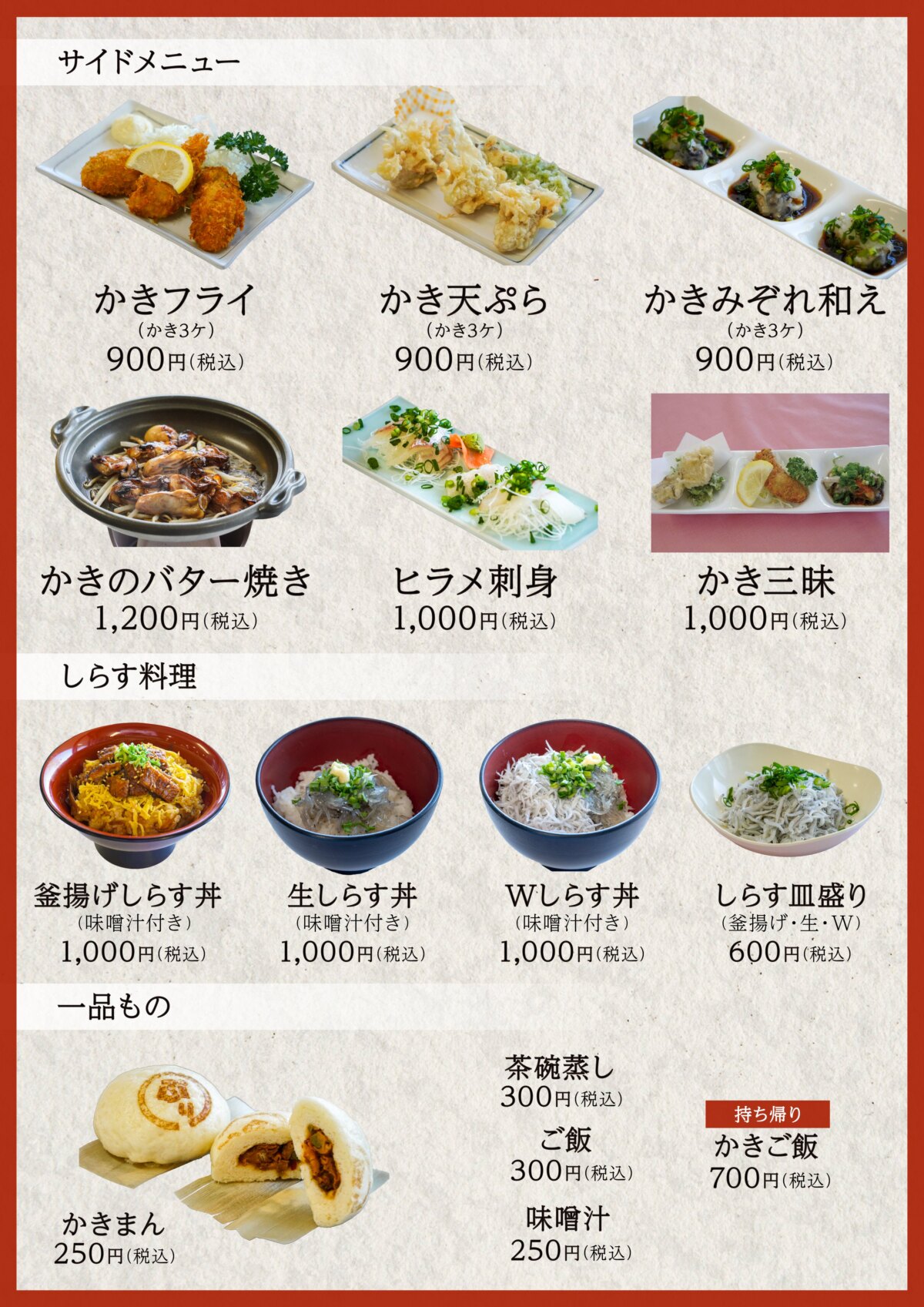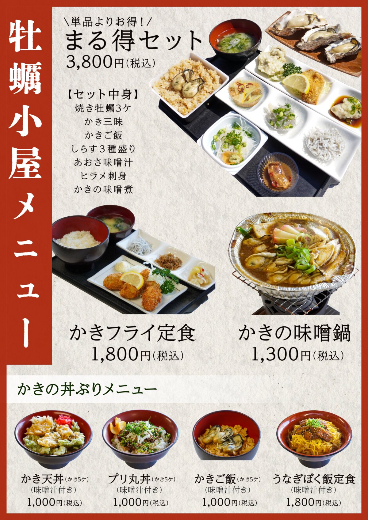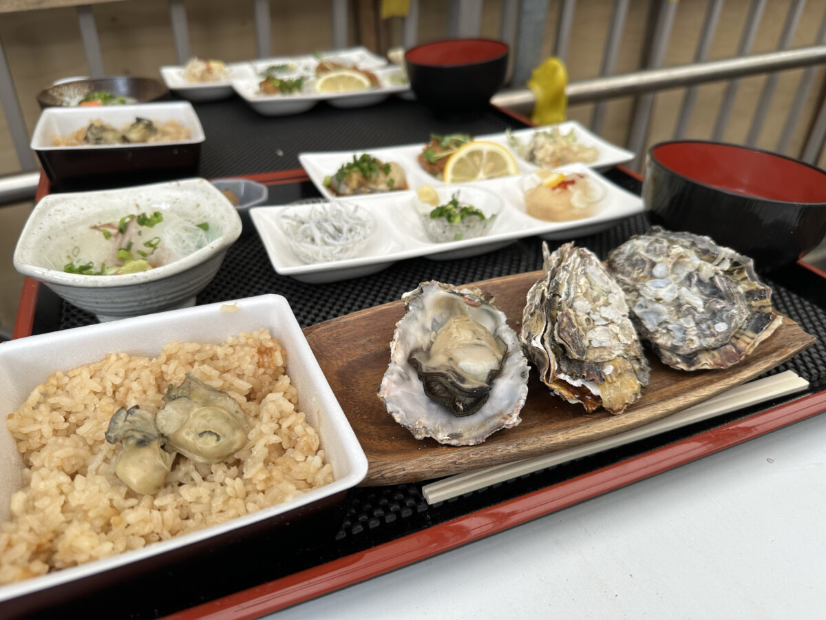 自分で焼いた牡蠣に加え、浜名湖の生シラスやヒラメのお刺身などのお料理をセットにしてご用意します。