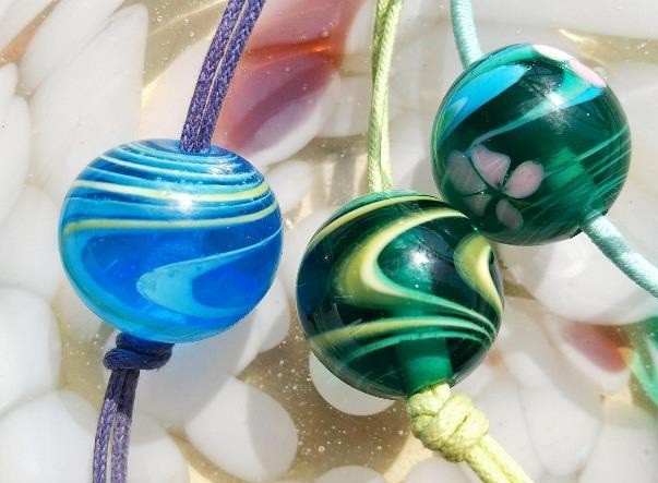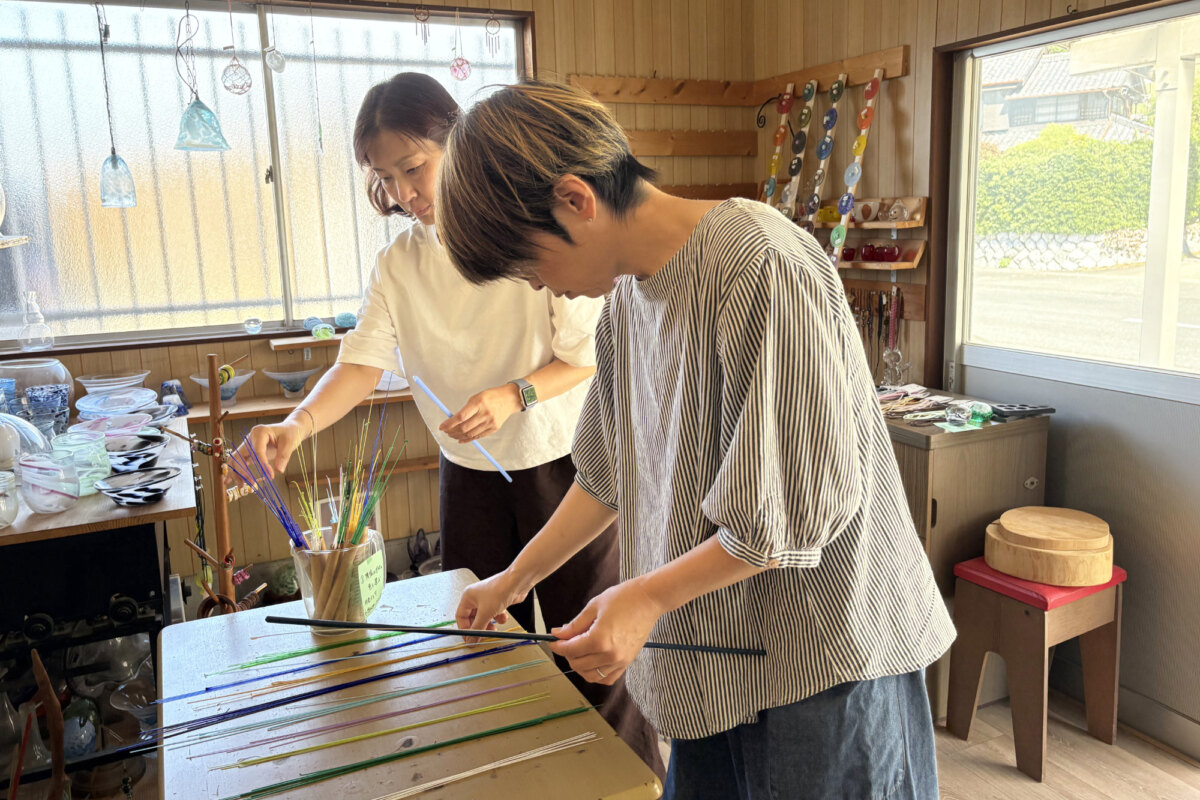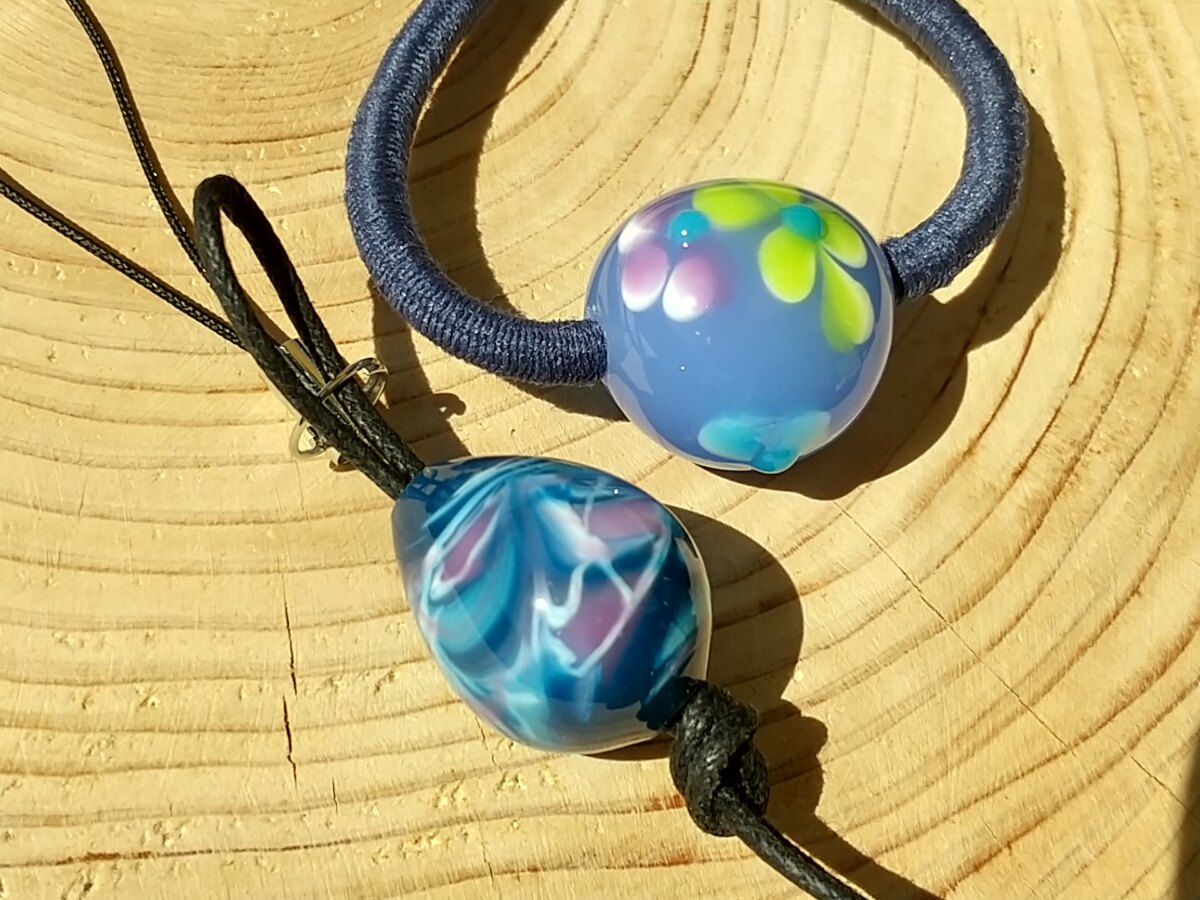 体験できること:ガラスを溶かし、色ガラスを重ねて自分だけの「とんぼ玉」づくり。完成品はブレスレットやヘアゴムなどに。