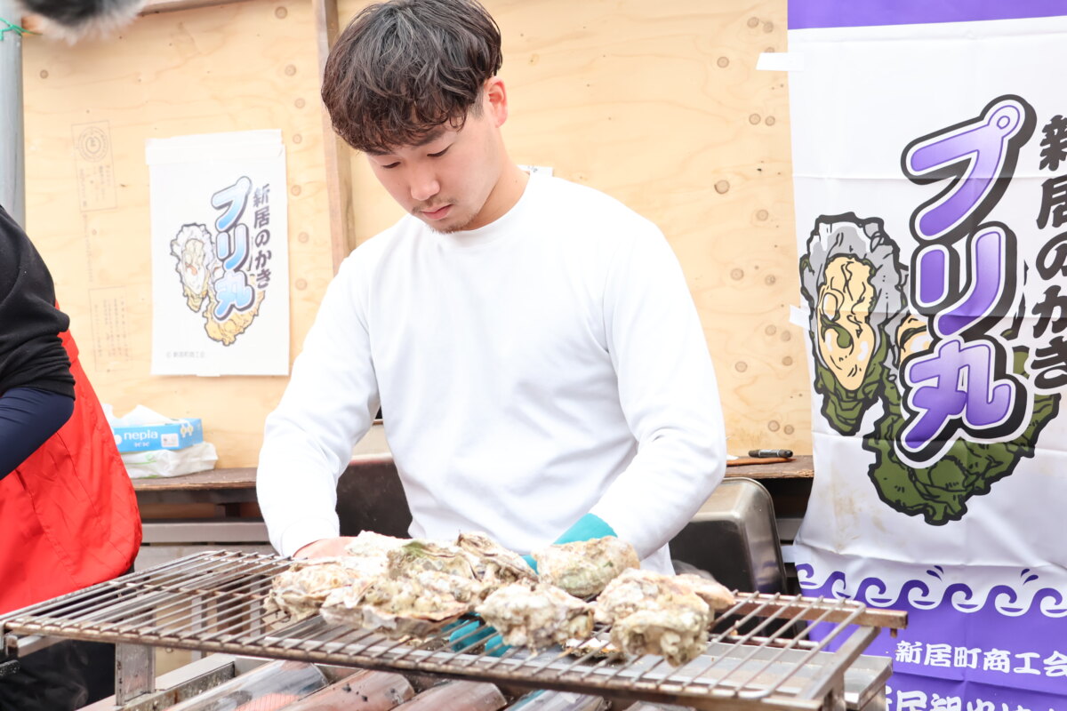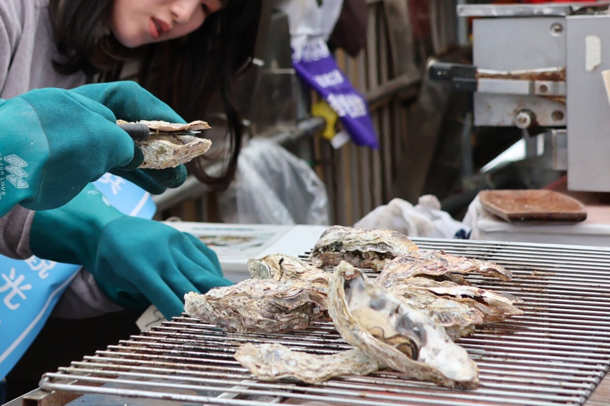 焼き時間や加減などをスタッフの方に教わりながら、目の前で牡蠣が焼けるのを待ちます。