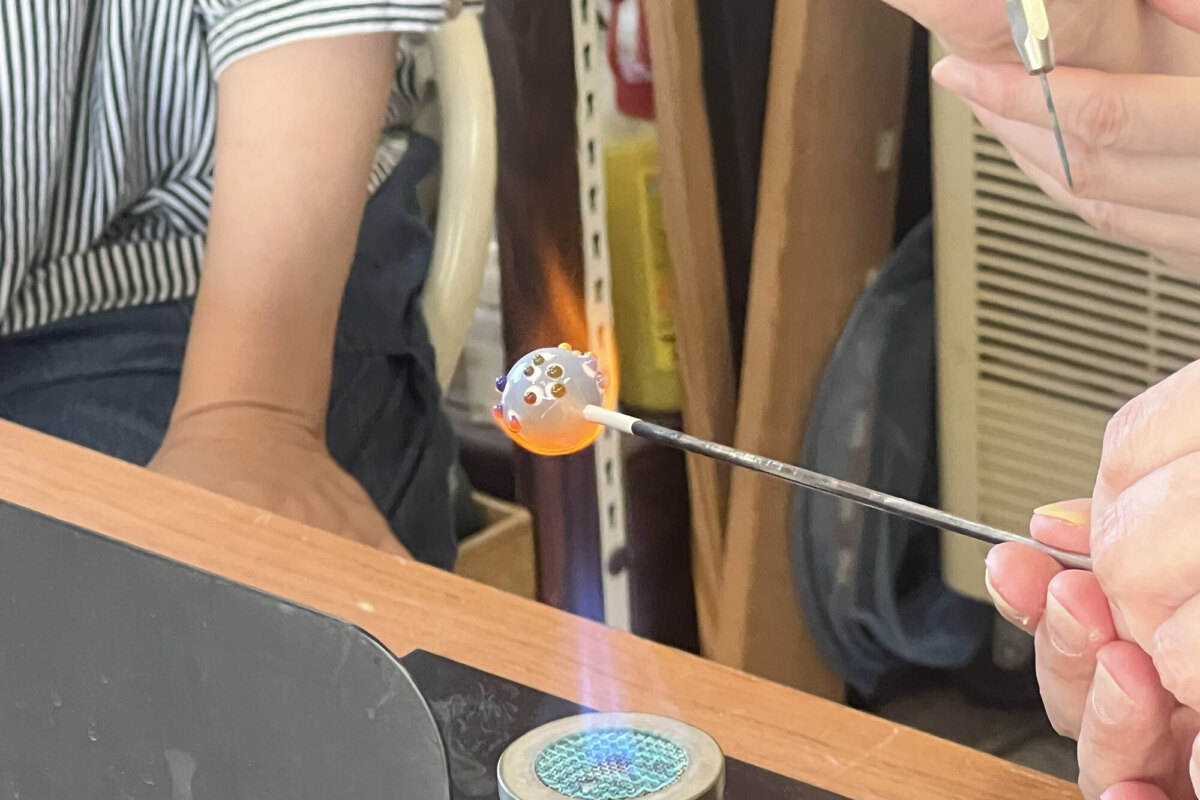色ガラスを置いて模様をつけ、さらに熱を加えながら形を整えていくと、次第に自分だけのとんぼ玉が姿を現します。