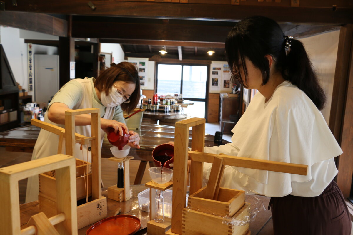 体験できること:もろみから醤油をしぼり、オリジナルラベルのボトルに詰めてお土産に。さらに、しぼりたての醤油でみたらし団子を作って食べられる。