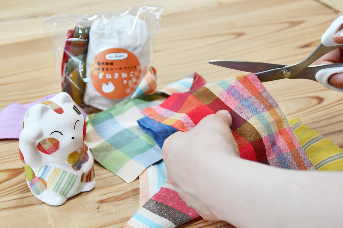 体験では、はぎれを切り取って、陶器の招き猫をデコレーションしていきます。
