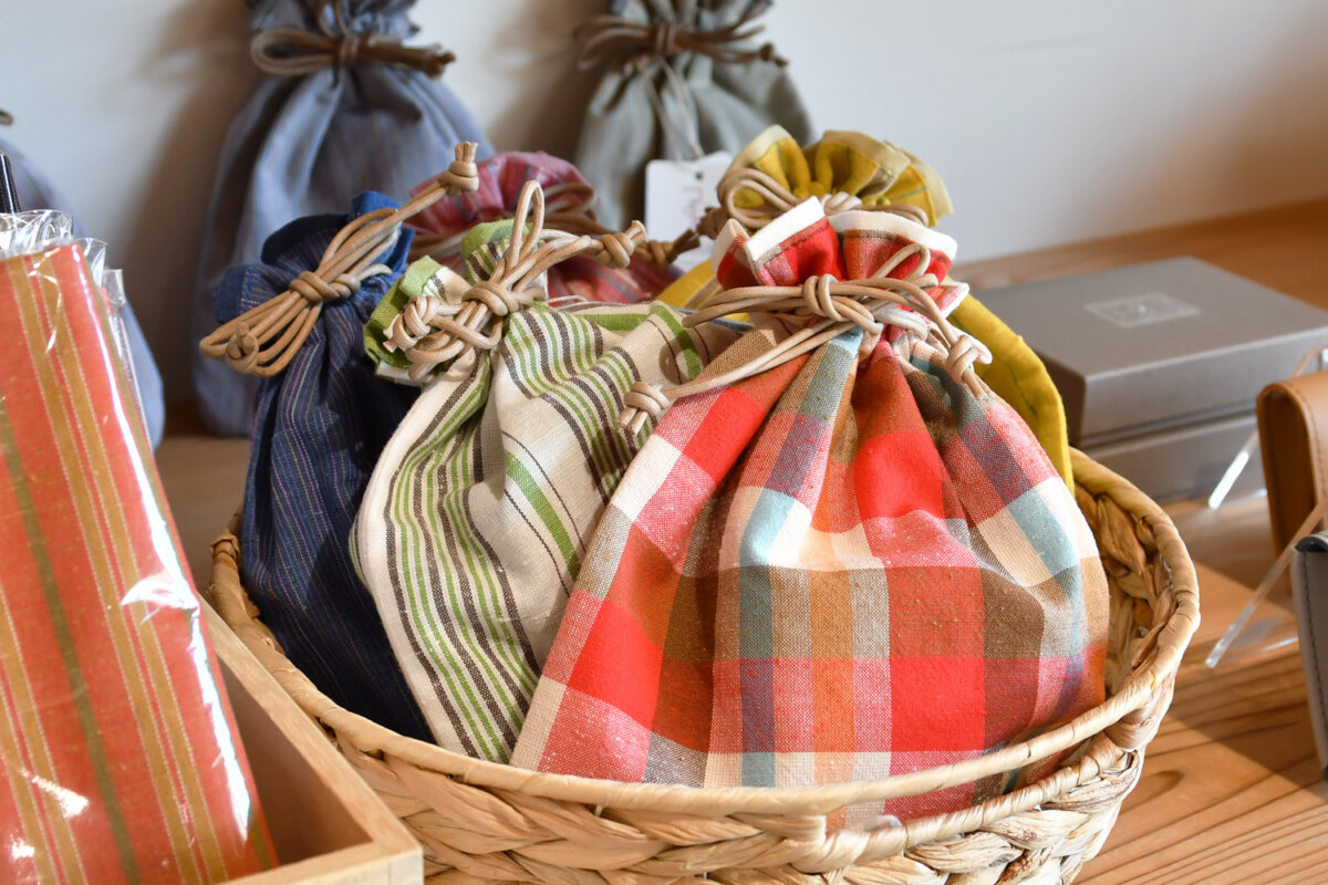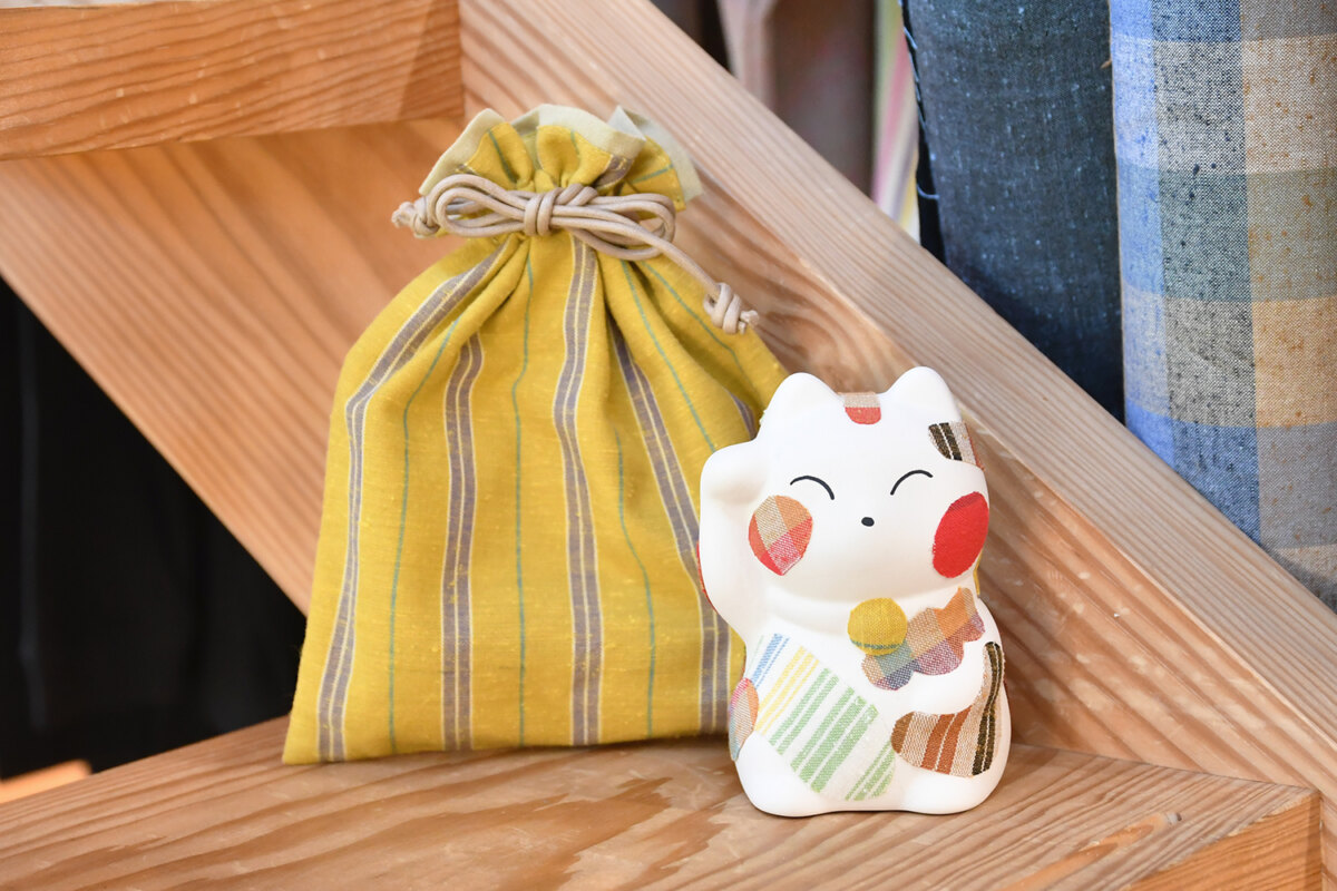 出来上がった招き猫は、遠州綿紬の巾着に入れてお持ち帰りいただけます。