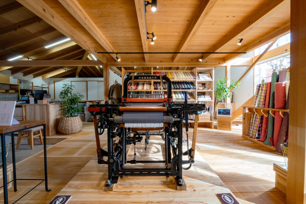 お店に展示された希少価値の高い「鈴木式織機製作所製 一挺杼 小巾織機」という産業遺産を見学しながら、歴史や文化を見て感じていただけます。