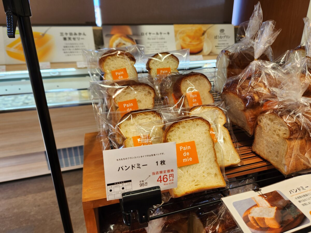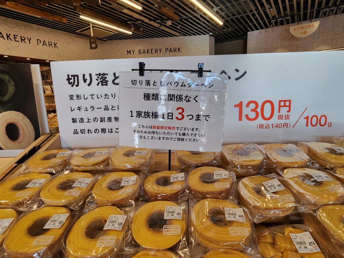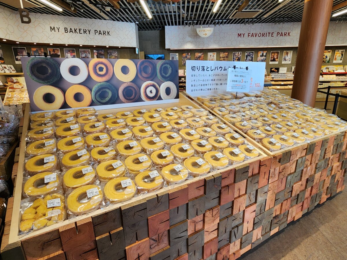 アウトレットコーナーには、製造過程でできてしまうバウムクーヘンやロールケーキの端、パンの耳などの副産物、形が不揃いな商品、消費期限の近い商品、過剰生産品などが並びます。