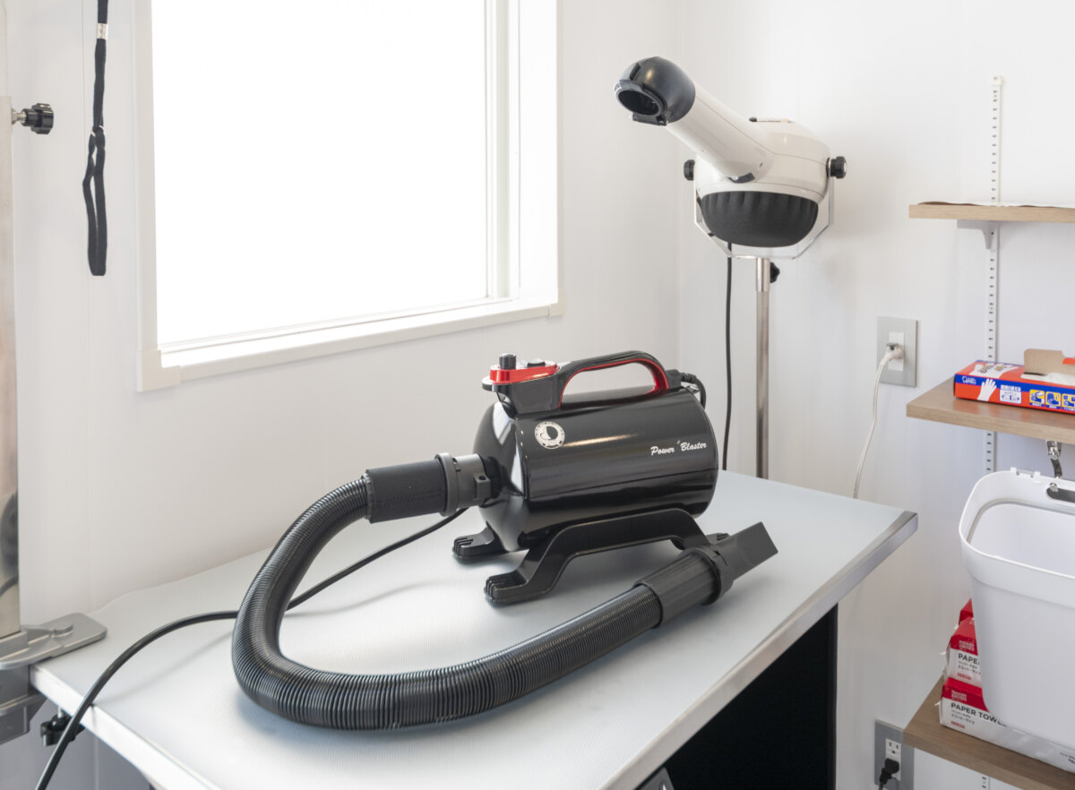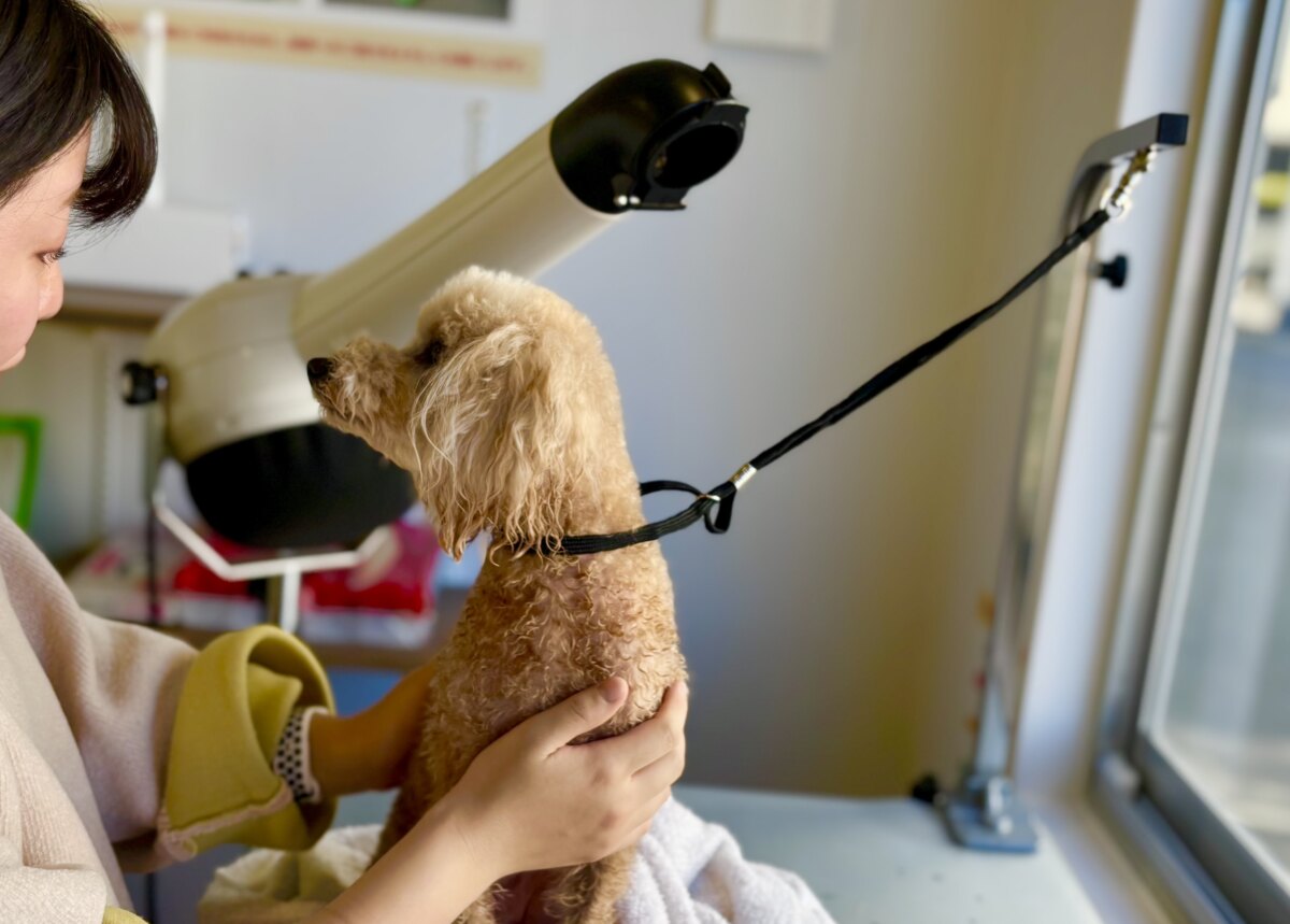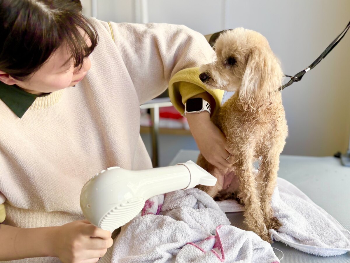 おやつをあげながら、こまめに休憩を入れて、あらゆる方向から丁寧に乾かしていきました。業務用の大型ドライヤーだからか、あっという間に乾かせました!