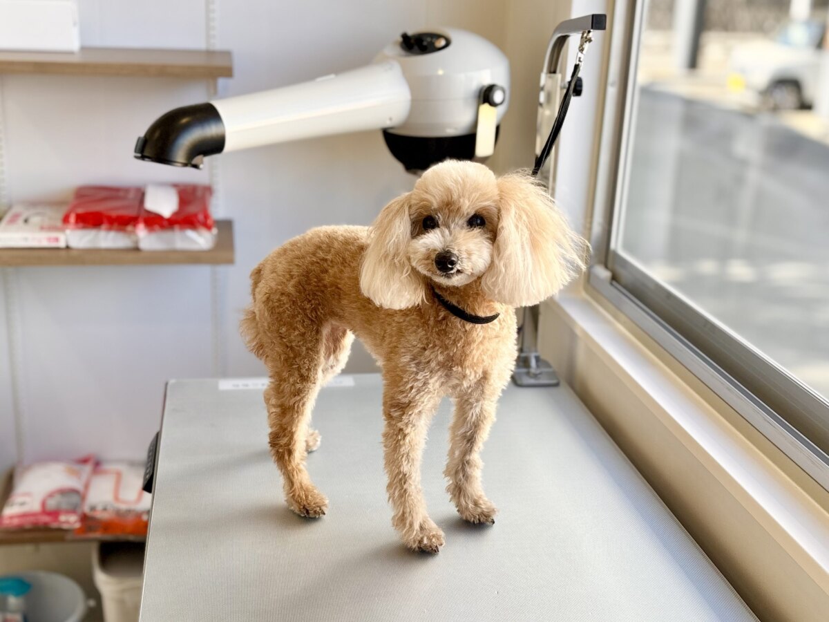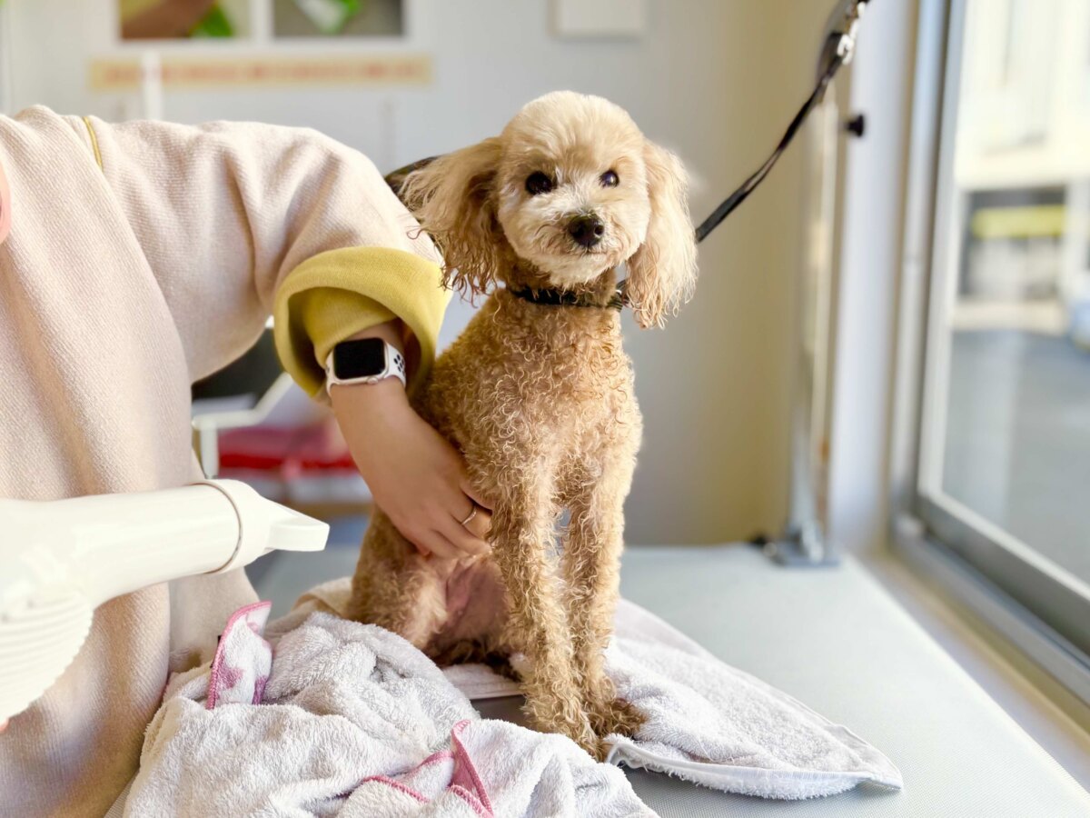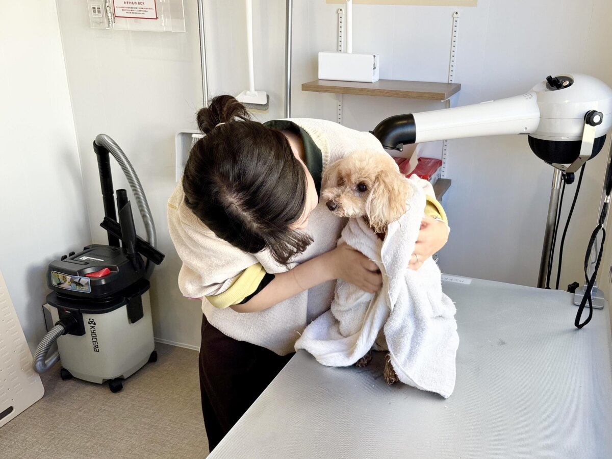 おやつをあげながら、こまめに休憩を入れて、あらゆる方向から丁寧に乾かしていきました。業務用の大型ドライヤーだからか、あっという間に乾かせました!