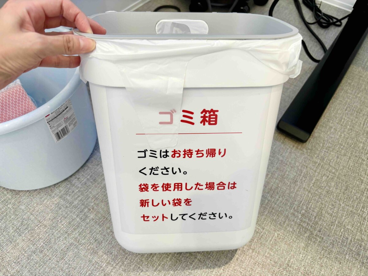 使用中に出たゴミは持ち帰ります。ゴミを捨てていたゴミ袋を取り出し、新しい袋をセットしたら退店準備完了。