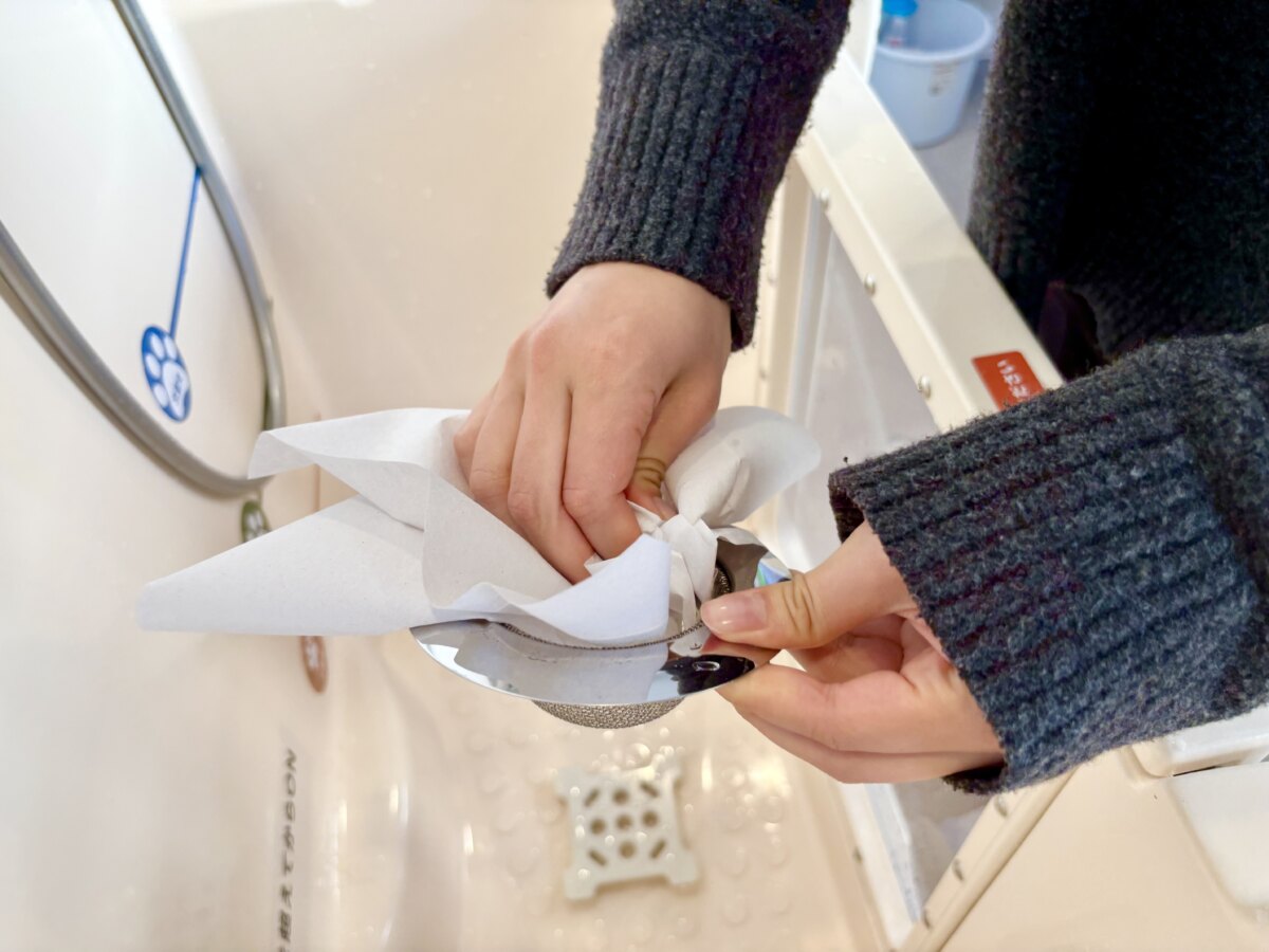 利用後の清掃も簡単です。シャワーを当てながらブラシでバスタブ内をこすって汚れを落とし、排水口の毛は専用ゴミ箱へ。
