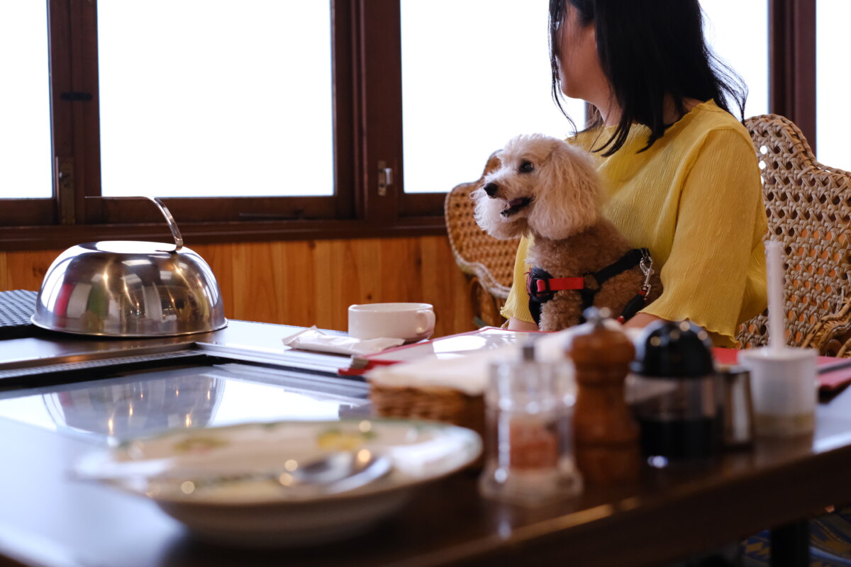 レストラン内では、わんこはリードフックにつないでも、椅子の上で過ごしてもOK。椅子は人間と共通なので、乗せる際は持参したタオルやシートを使うようにしましょう。甘えん坊なわんこは、お膝で過ごしても構いません。