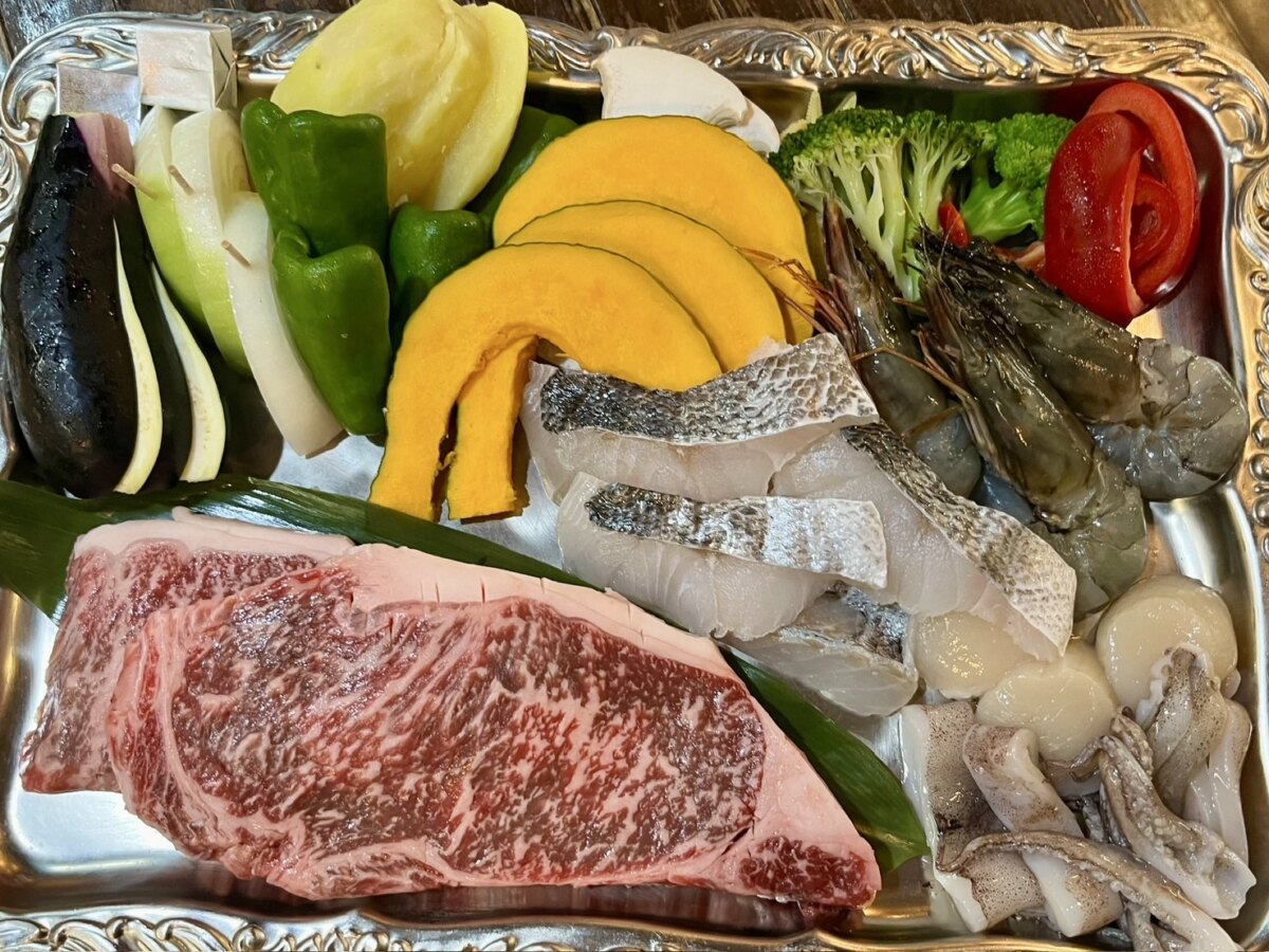 地元産直の新鮮野菜と、真鯛、エビ、ホタテ、イカ、そして厚切りのステーキ肉!