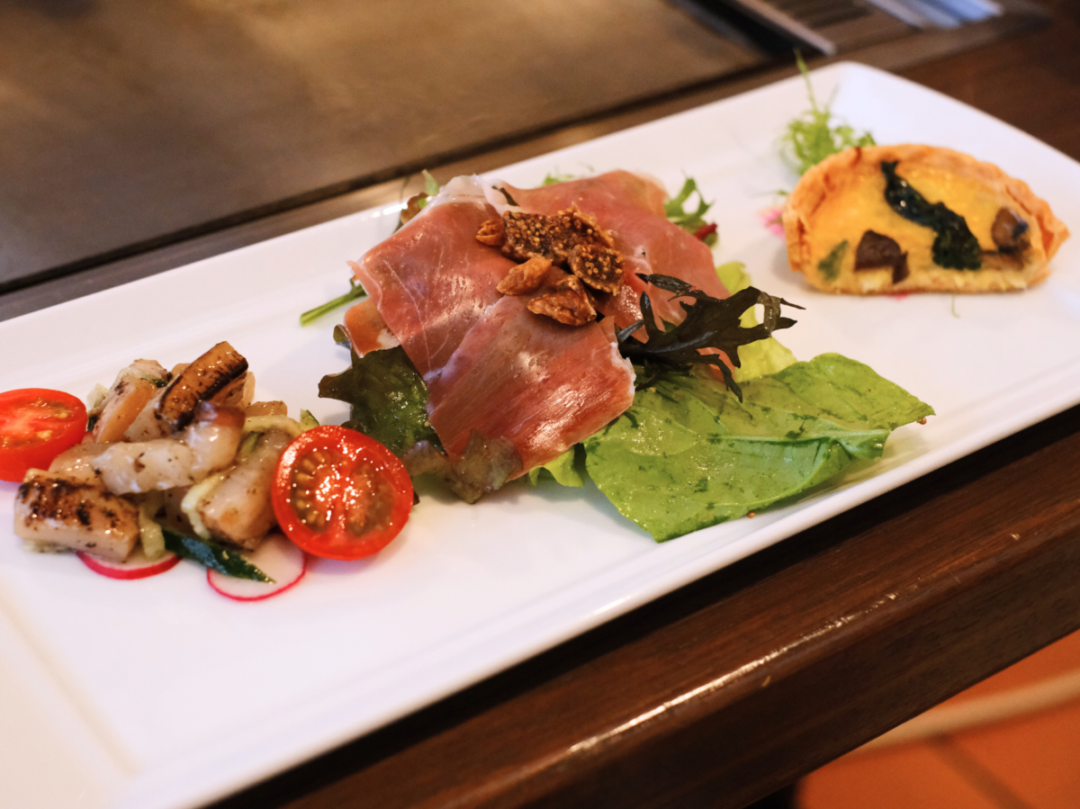 まずは季節の前菜とスープをいただきます。この日の前菜は、北海道産の水ダコ、キッシュ、ドライイチジクと生ハムのサラダでした。