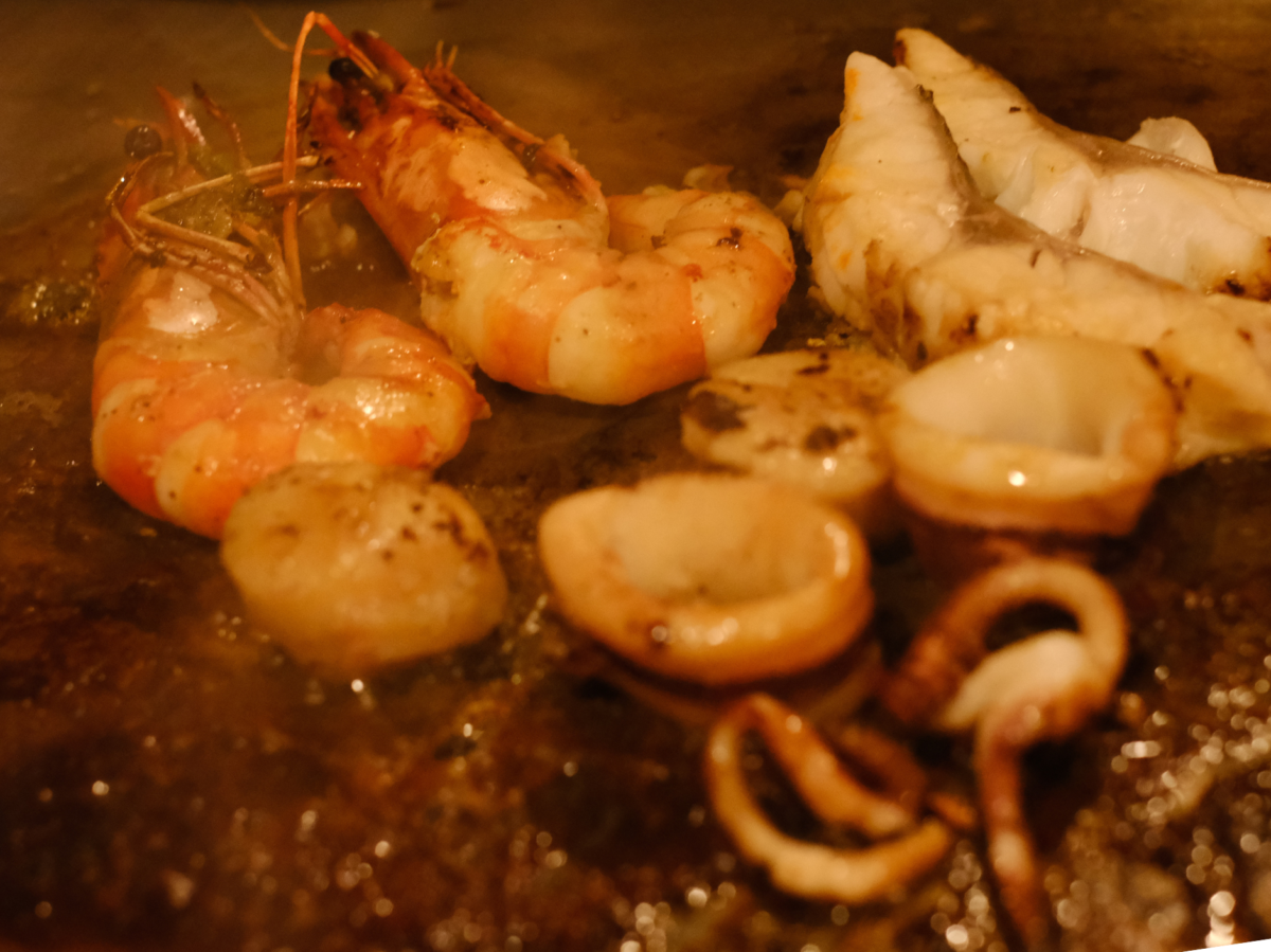 遠州灘で採れた真鯛、エビ、ホタテ、イカを鉄板に並べ、たっぷりとバターを塗り、白ワインをかけて蓋をします。