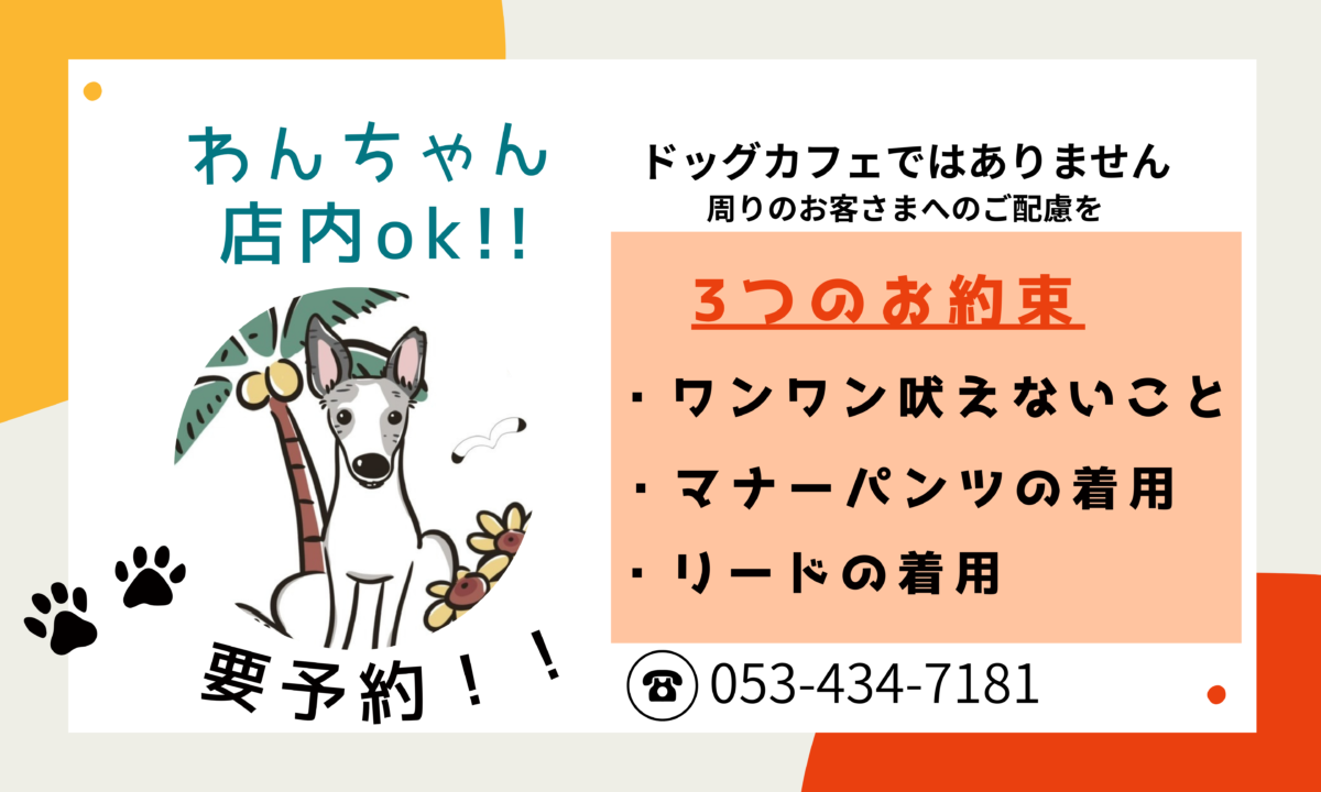 わんこ情報:店内同伴OK、リード・マナーベルト着用必須。来店前に連絡