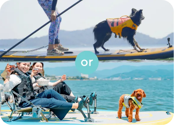 わんちゃんと楽しむアクティビティSUPを体験したことがない人でも、初心者向けのプログラムなので安心!ボート上で飼い主とバランスと取る感覚、浜名湖の景色、湖面の揺れや風のにおいなど、わんこも普段とは違う刺激を経験することができます。浜名湖の水上で、愛犬とのSUPコミュニケーションで信頼を深めましょう。