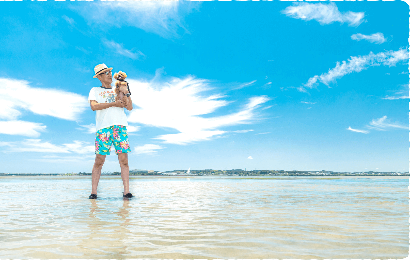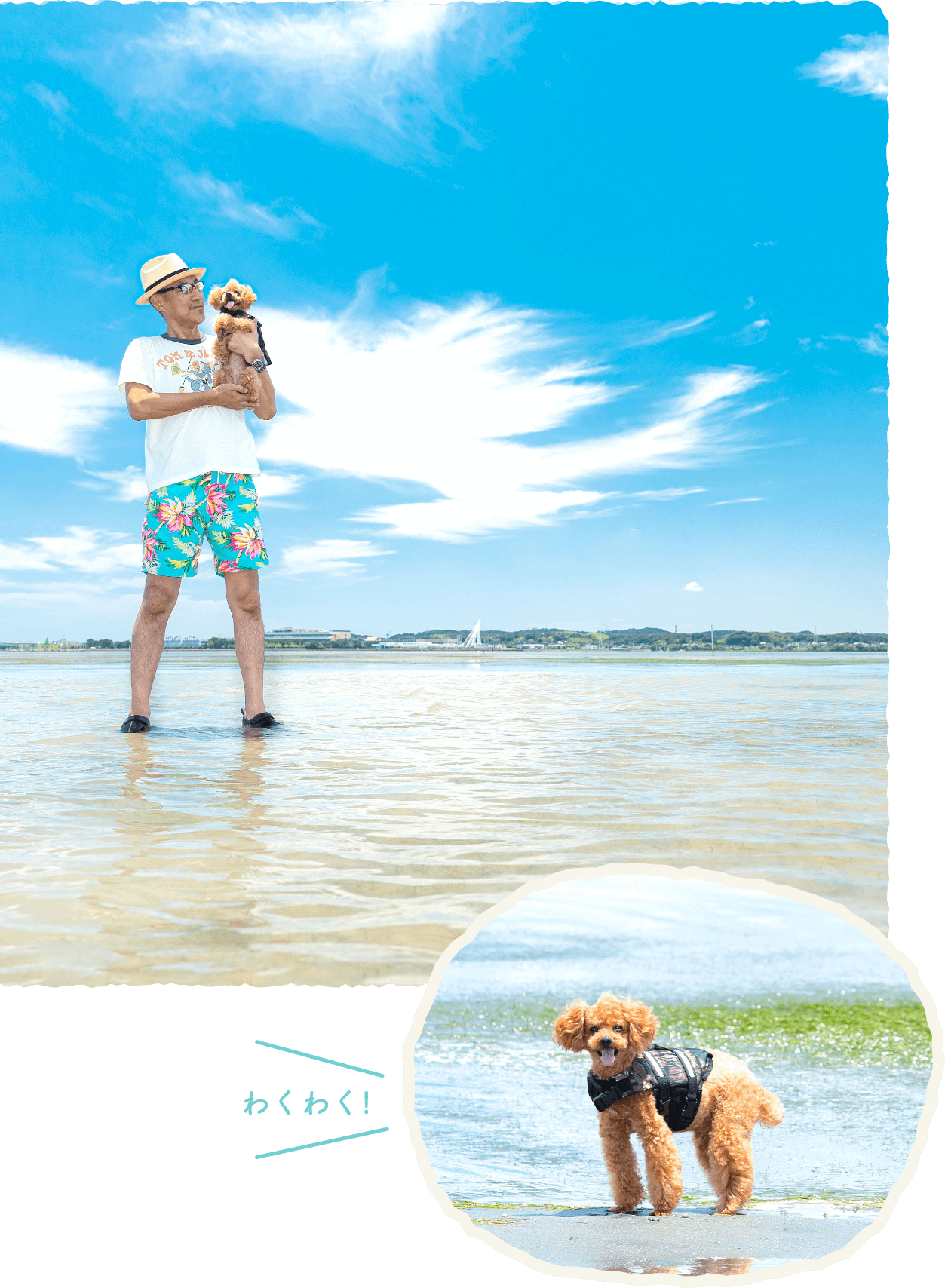 浜名湖の真ん中でワンと叫ぶ浜名湖の南端、今切、弁天島の景色を見ながらまれに現れる浅瀬に愛犬と立ってみよう!あたり一面、空と湖に囲まれながら撮る写真は、思い出に残る一枚になること間違いなしです。