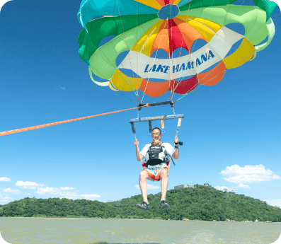 わんダフルパラセーリングモーターボートでフライトポイントまで移動して、パラシュートをつけて大空にテイクオフ! 高さ40~80mの高さまでゆっくり上昇し、7~8分間の空中散歩を楽しむことができます。